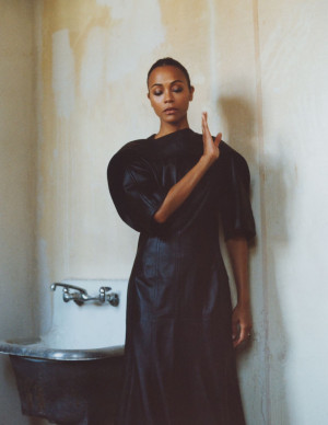 Entre expression théâtrale et poses dignes de sculptures, Zoe Saldana incarne la femme moderne : belle, puissante et capable de porter des vêtements aussi dramatiques que son expression.