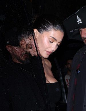 Vêtue d'une mini-robe en cuir noir, Kylie nous rappelle que, même sous la pluie, le cuir reste une valeur sûre.