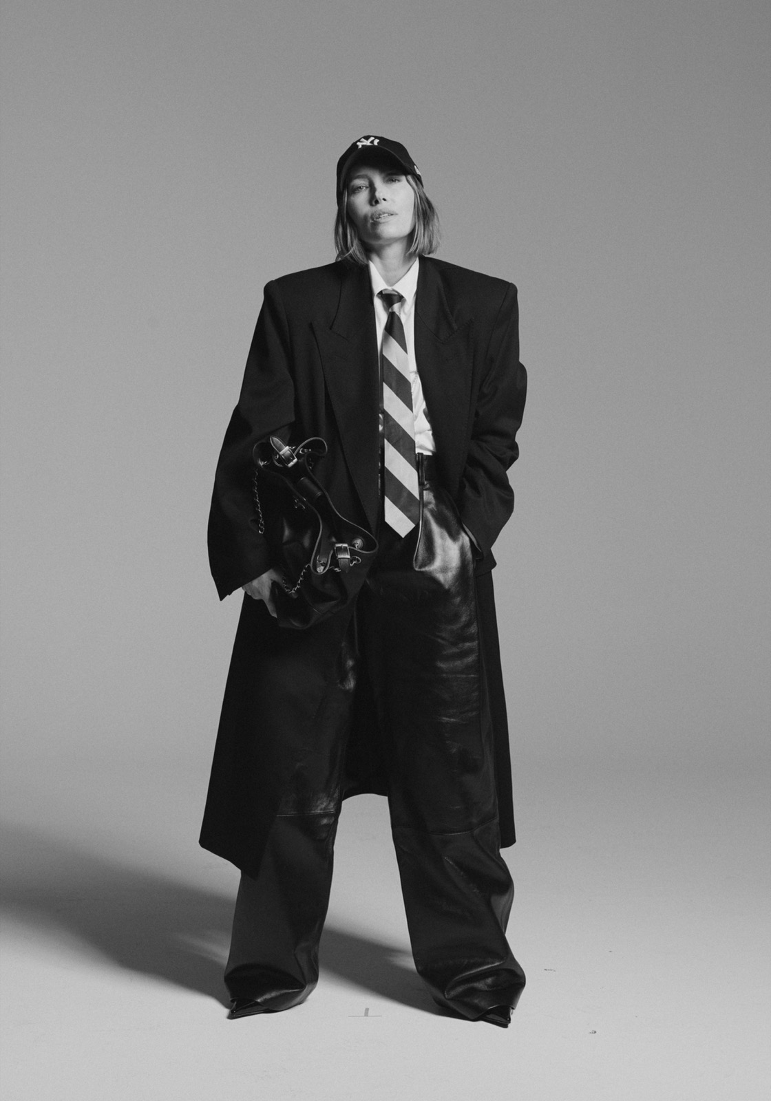 Puis, hop, changement de décor : en cuir rouge et lunettes de soleil, elle impose une allure de rockstar posée sur un fauteuil plastique ! Entre jeans froncés et sac chic, elle jongle entre casual et haute couture avec un sourire énigmatique.