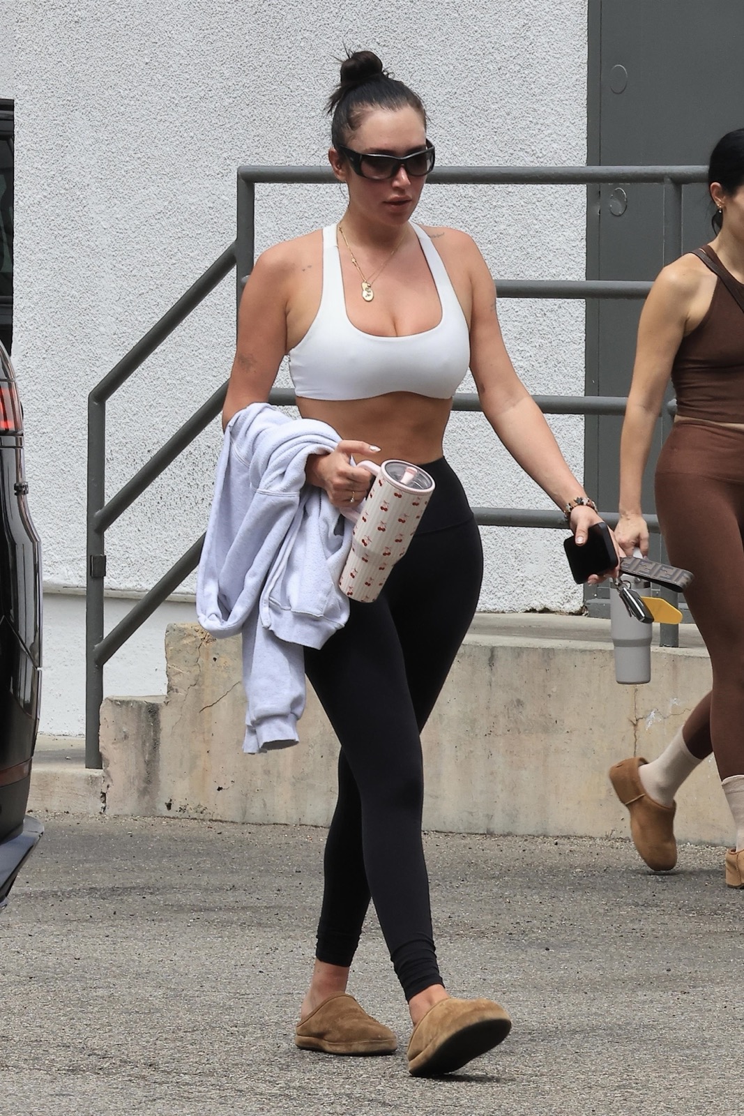 Le bitume de Los Angeles n’a jamais vu yoga plus torride. En brassière blanche et leggings noirs, Anastasia Karanikolaou transforme la sortie de Pilates en scène d’adoration corporelle.
