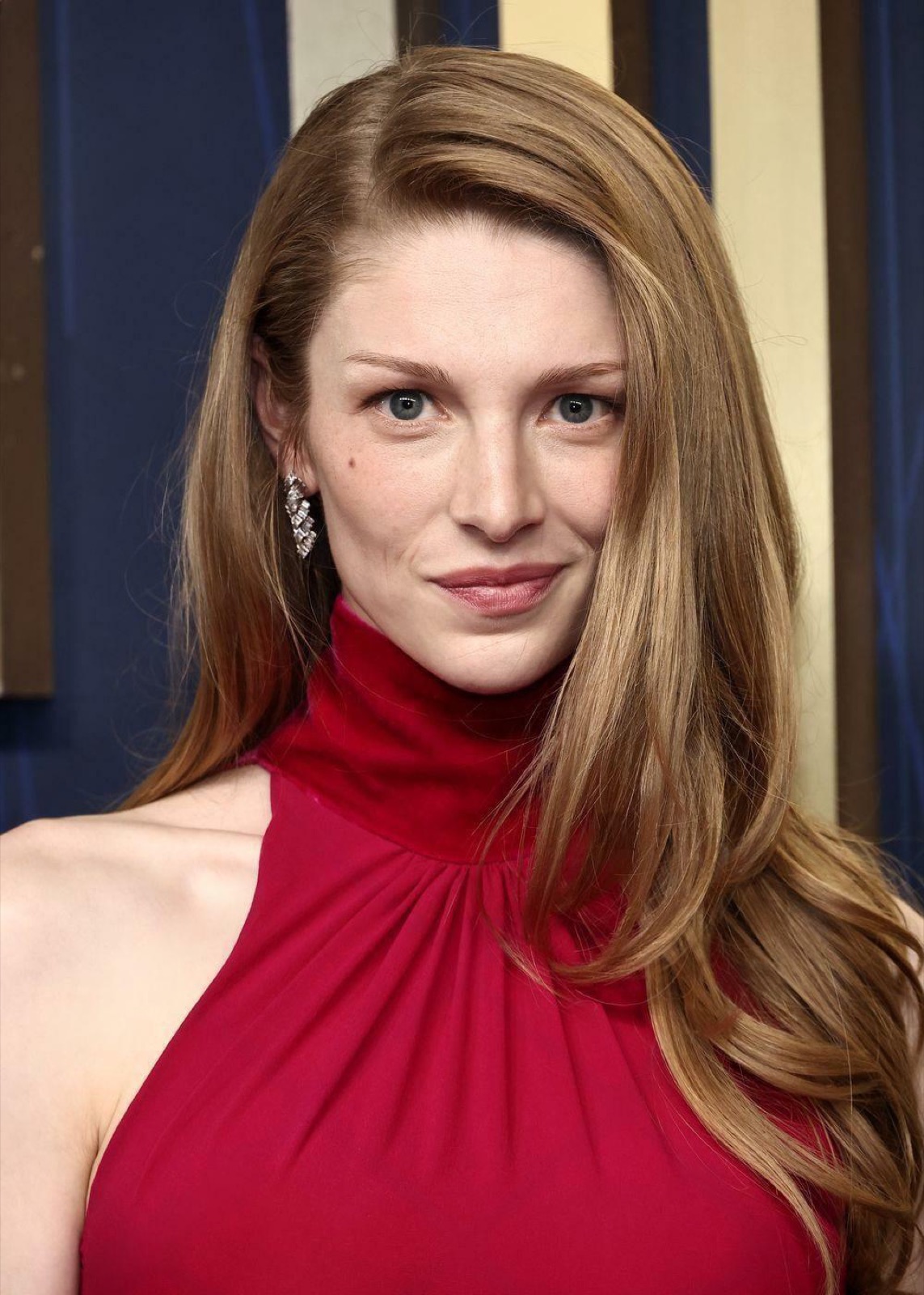 Dans une robe écarlate aux reflets velours, Hunter se fige devant les logos des Emmys comme si chaque angle valait une couverture de magazine. Les caméras se nourrissent de cette immobilité étudiée.