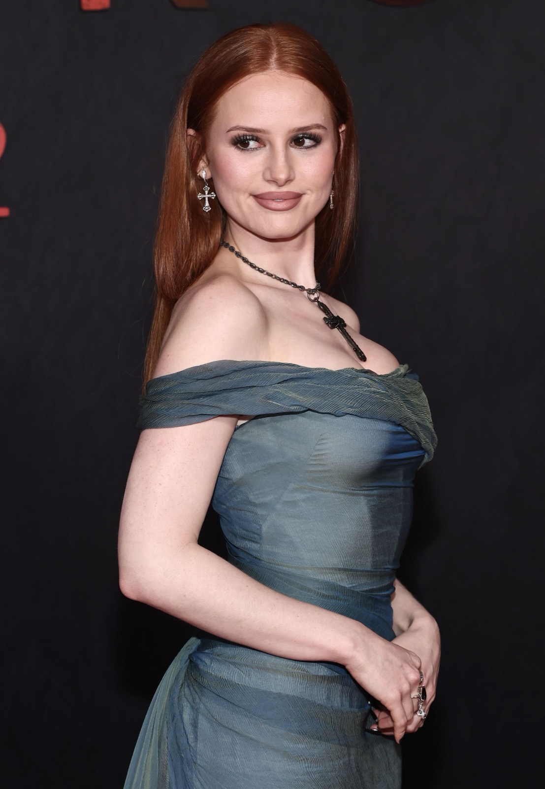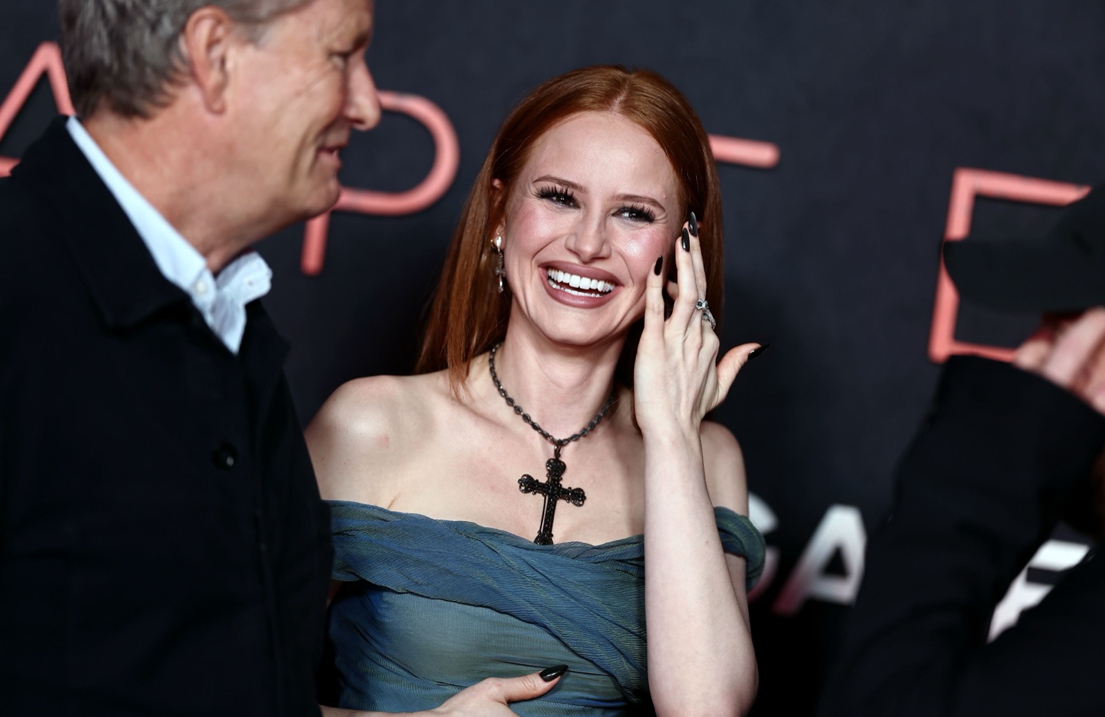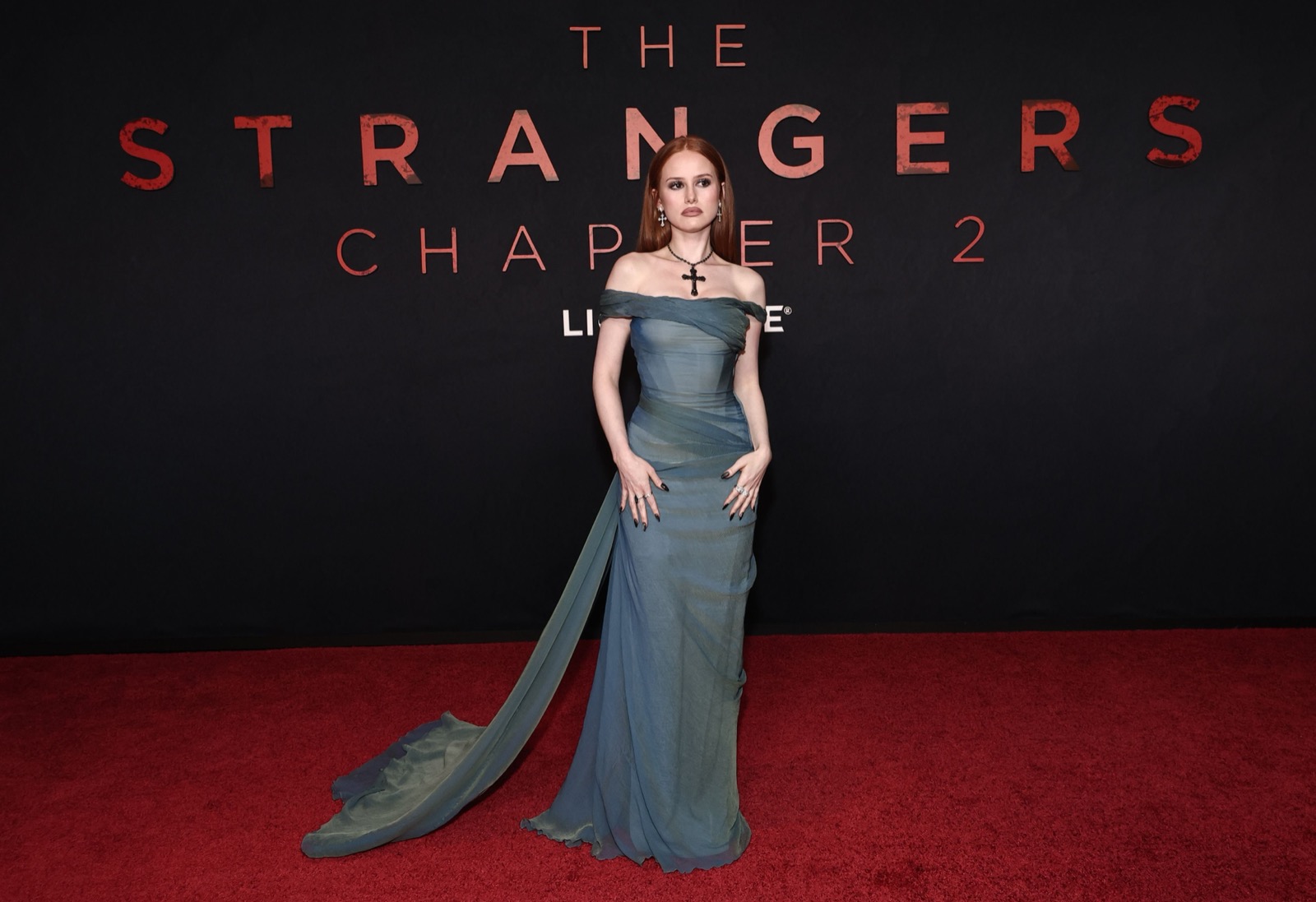 En drapée vert pâle, Madelaine Petsch flottait sur le tapis rouge comme une apparition sortie d’un rêve gothique, traîne ondulante et croix dramatique en guise d’amulette.