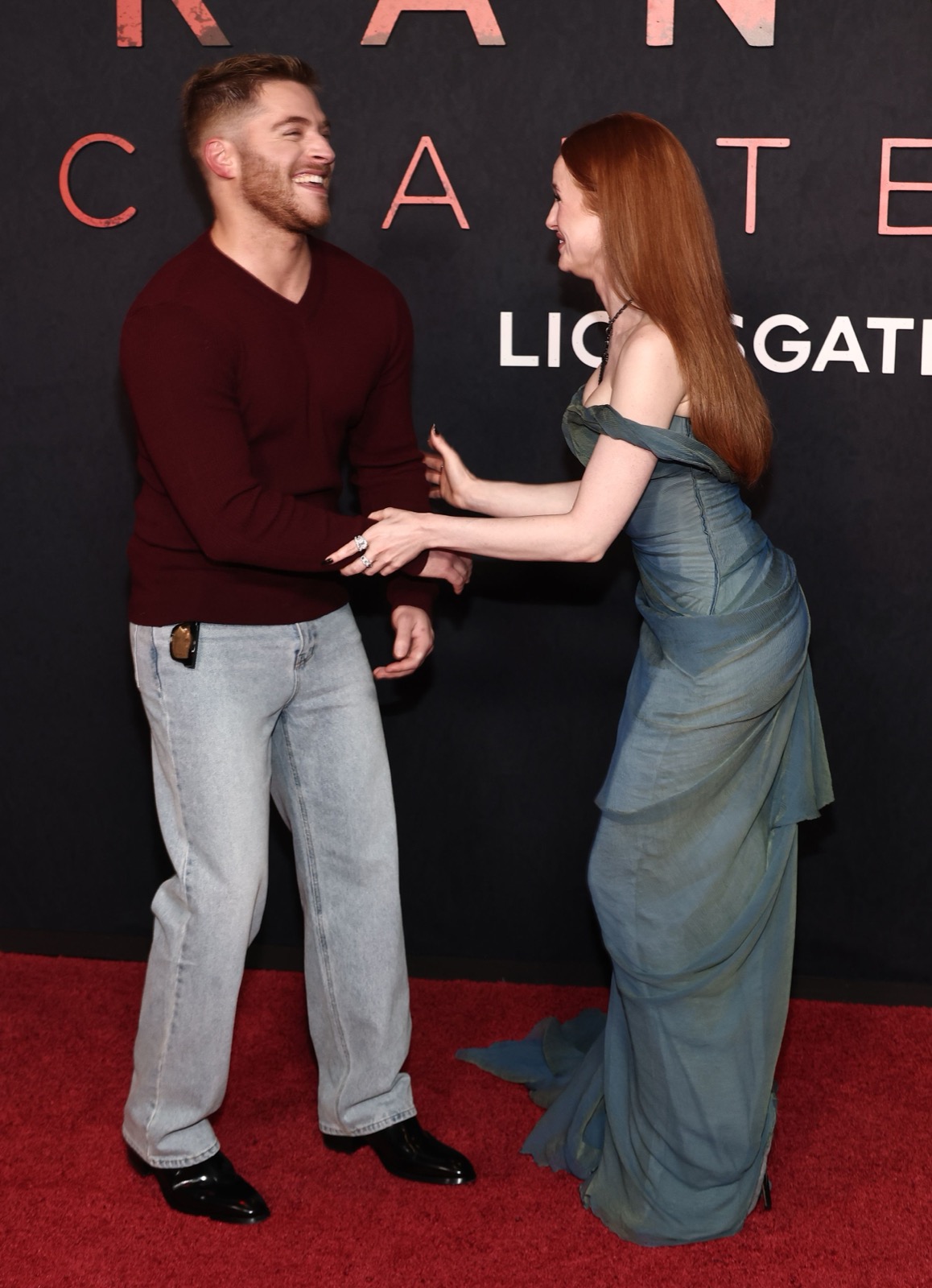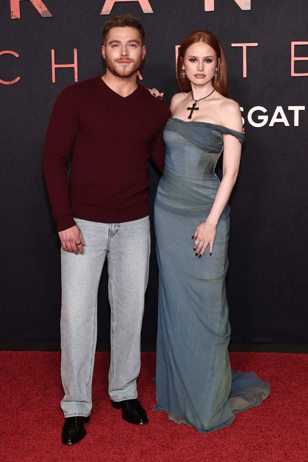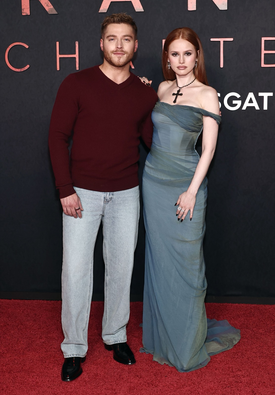 En drapée vert pâle, Madelaine Petsch flottait sur le tapis rouge comme une apparition sortie d’un rêve gothique, traîne ondulante et croix dramatique en guise d’amulette.