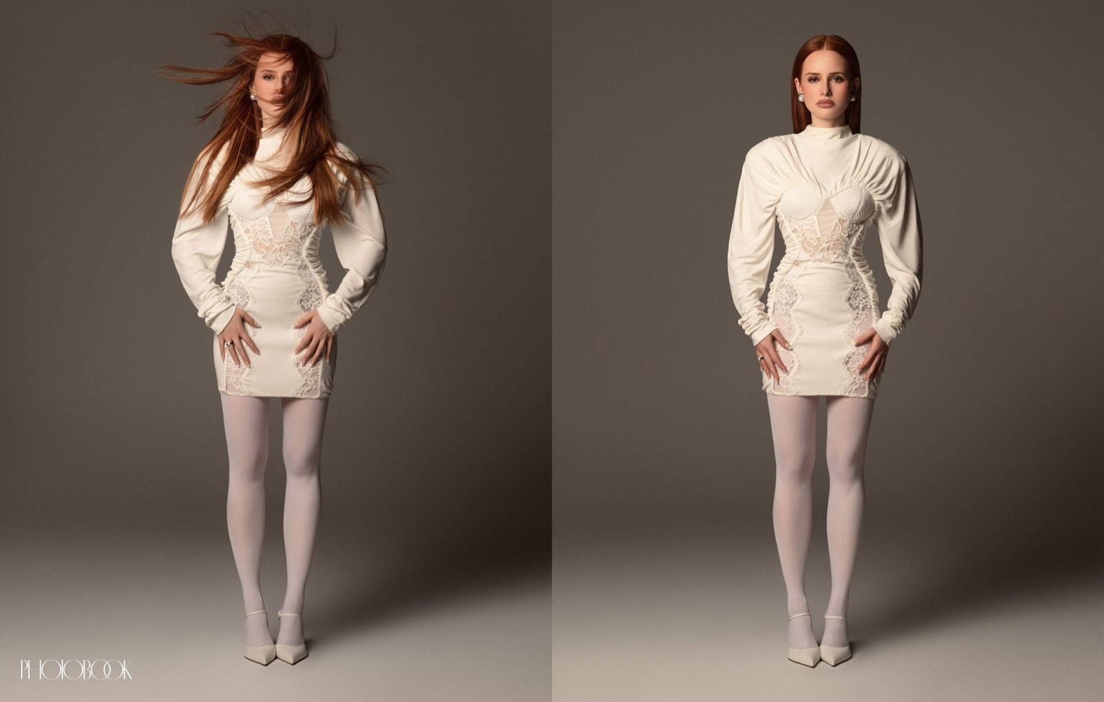 Dans ce shooting pour Photobook Magazine, Madelaine Petsch déploie son arsenal de provocation : corseterie noire, franges théâtrales et bottes cavalières. Une cow-girl sortie d’un cabaret gothique, prête à fouetter le bon goût.