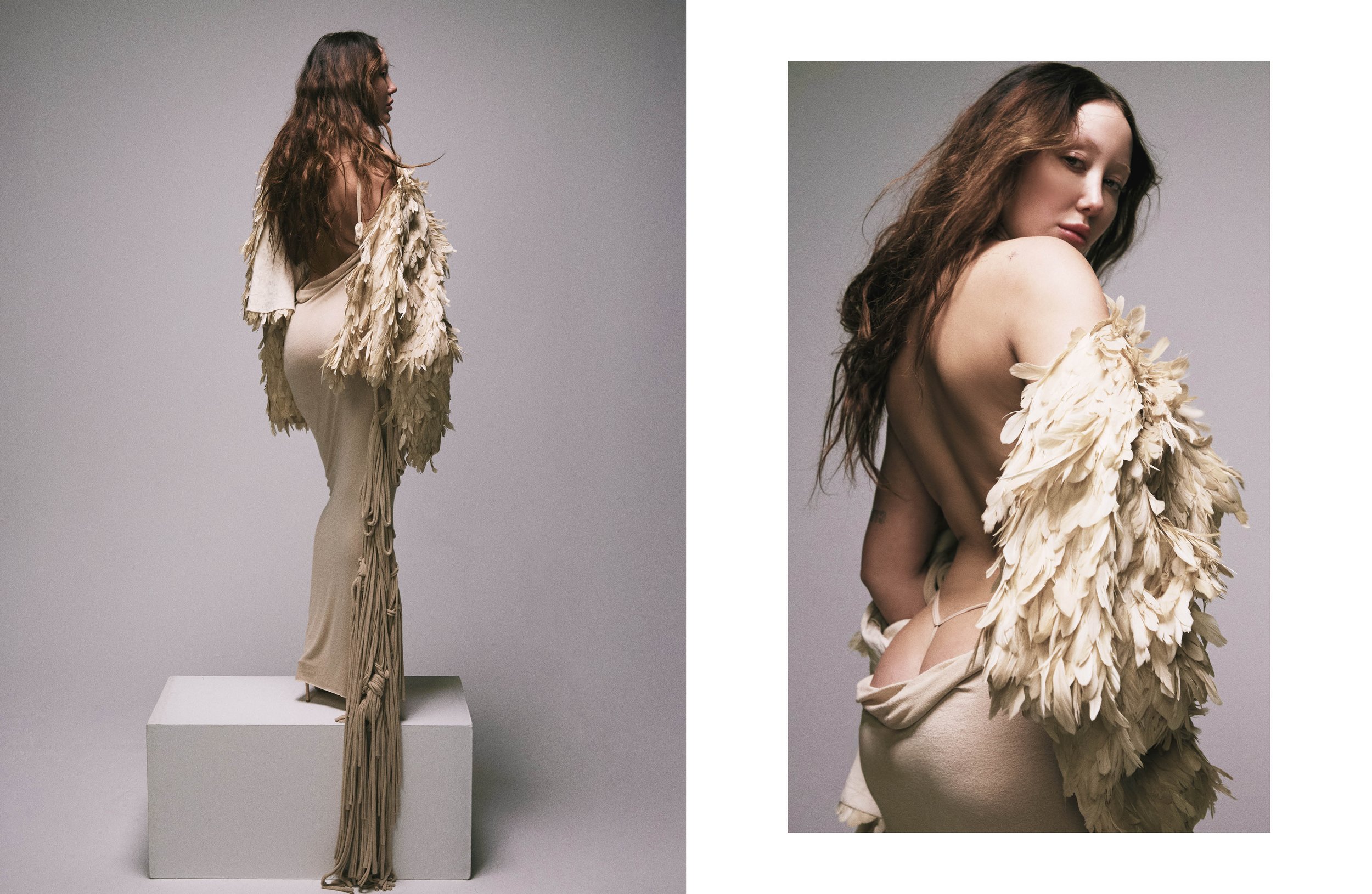 En manteau de plumes beige, elle se dresse comme une idole fatiguée, sirène échouée qui transforme ses épines en ailes sensuelles, prêtes à lacérer l’innocence.