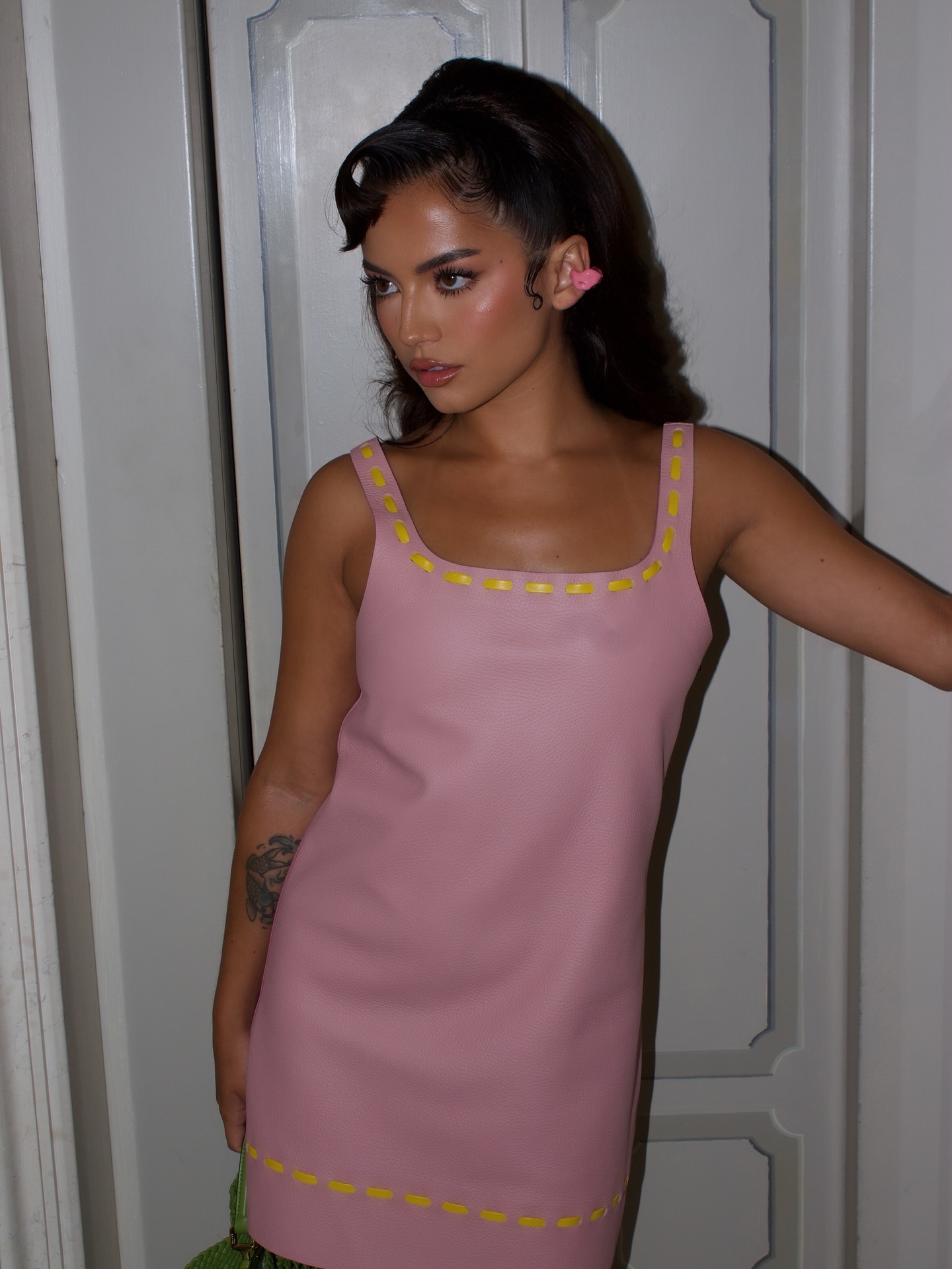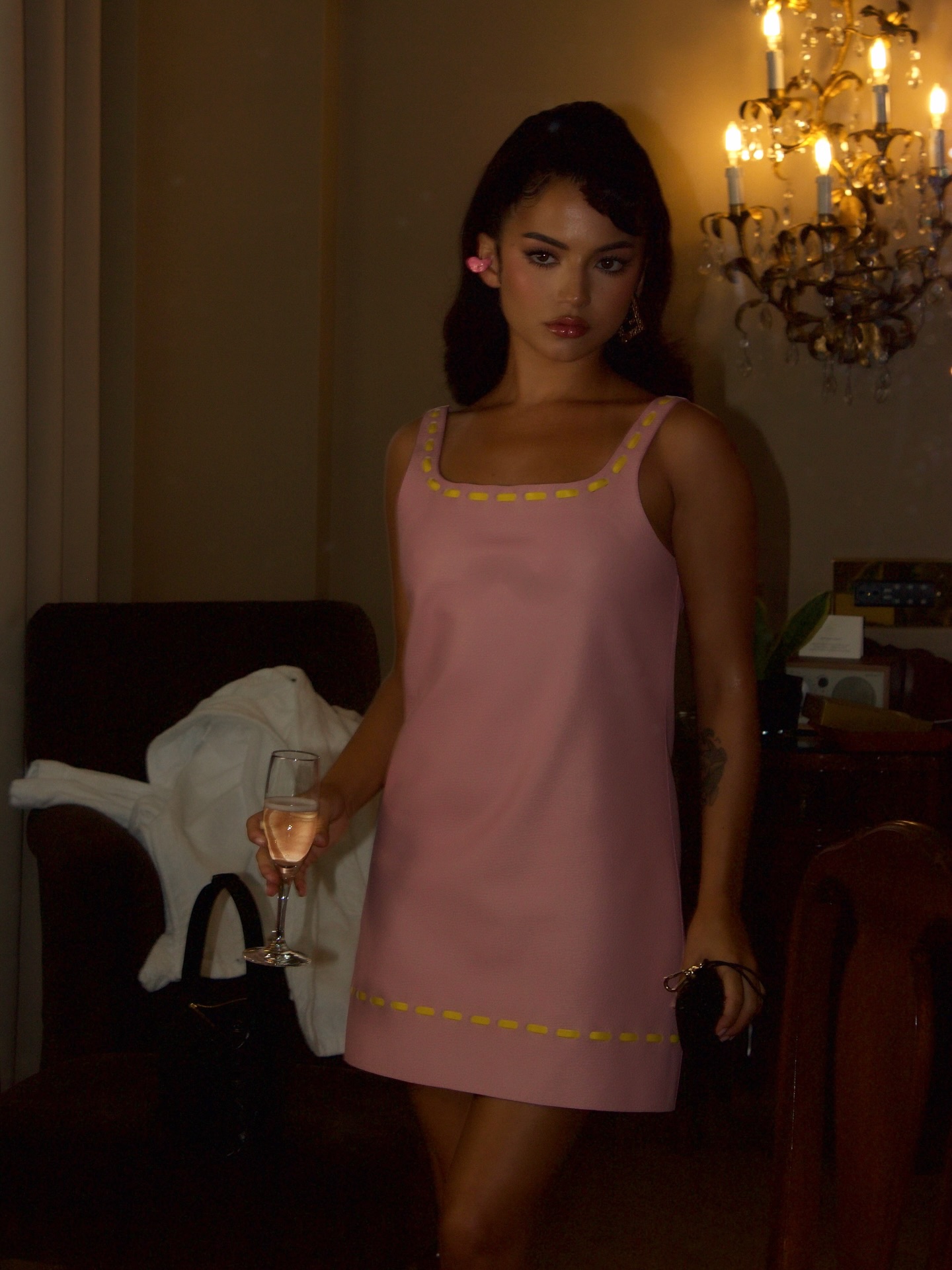 Assise comme une poupée provocante, Isabela exhibe sa robe rose tendre, ourlée de détails jaunes espiègles, transformant le défilé Fendi en terrain de jeu rétro-candide.