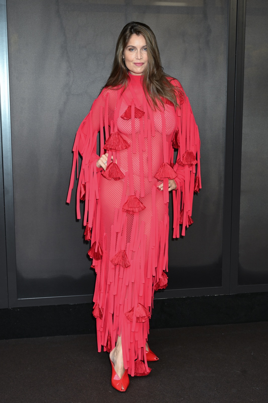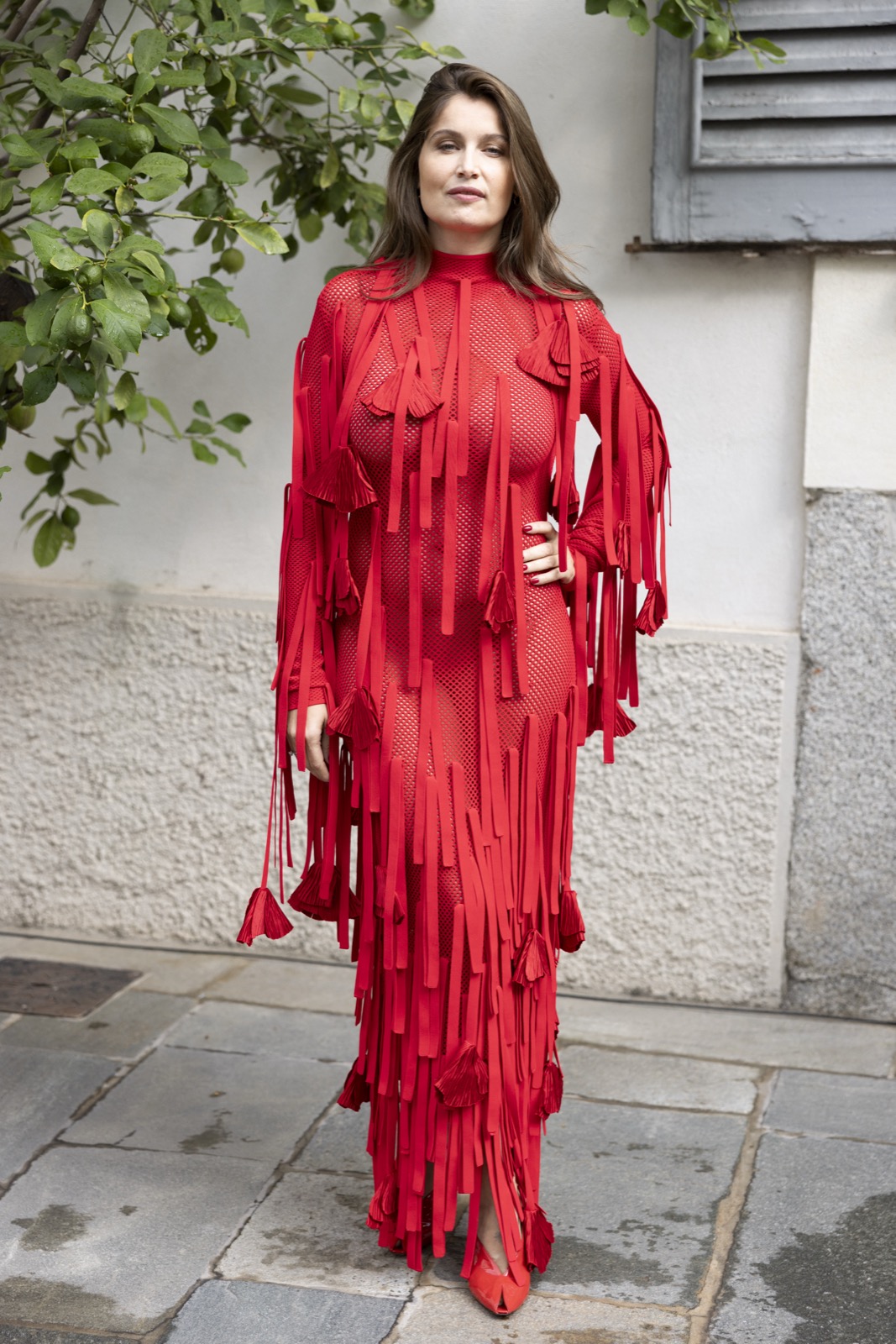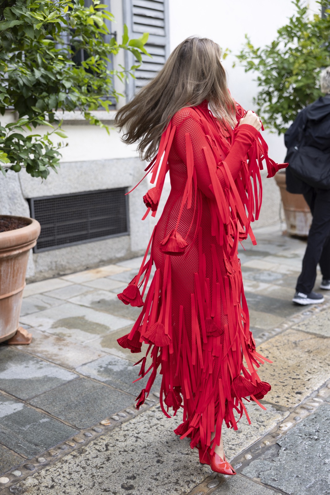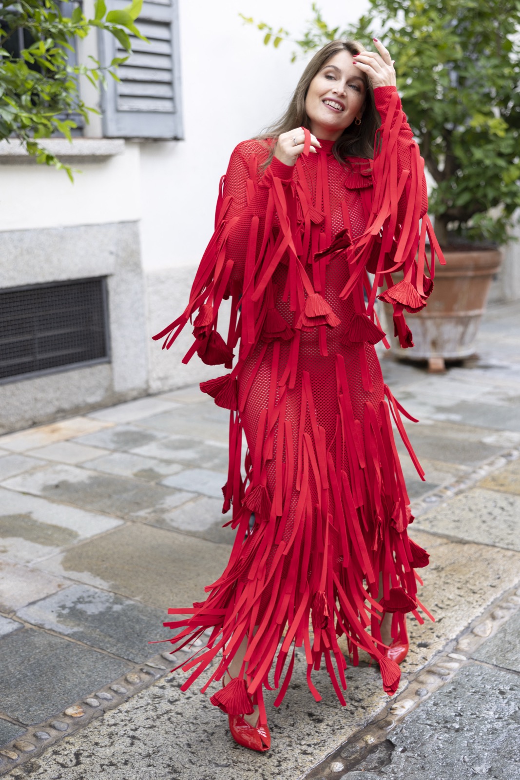 Avec ses franges rouges en rafales, elle transforme chaque pas en tempête sensuelle, comme si la mode devenait un strip-tease climatique de haute couture.