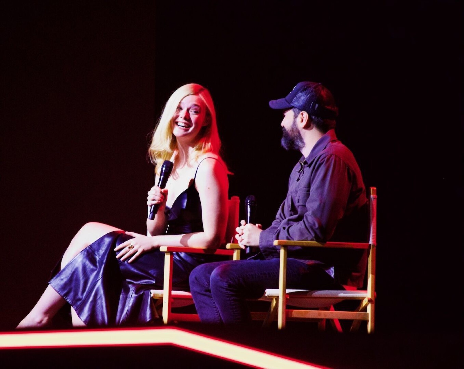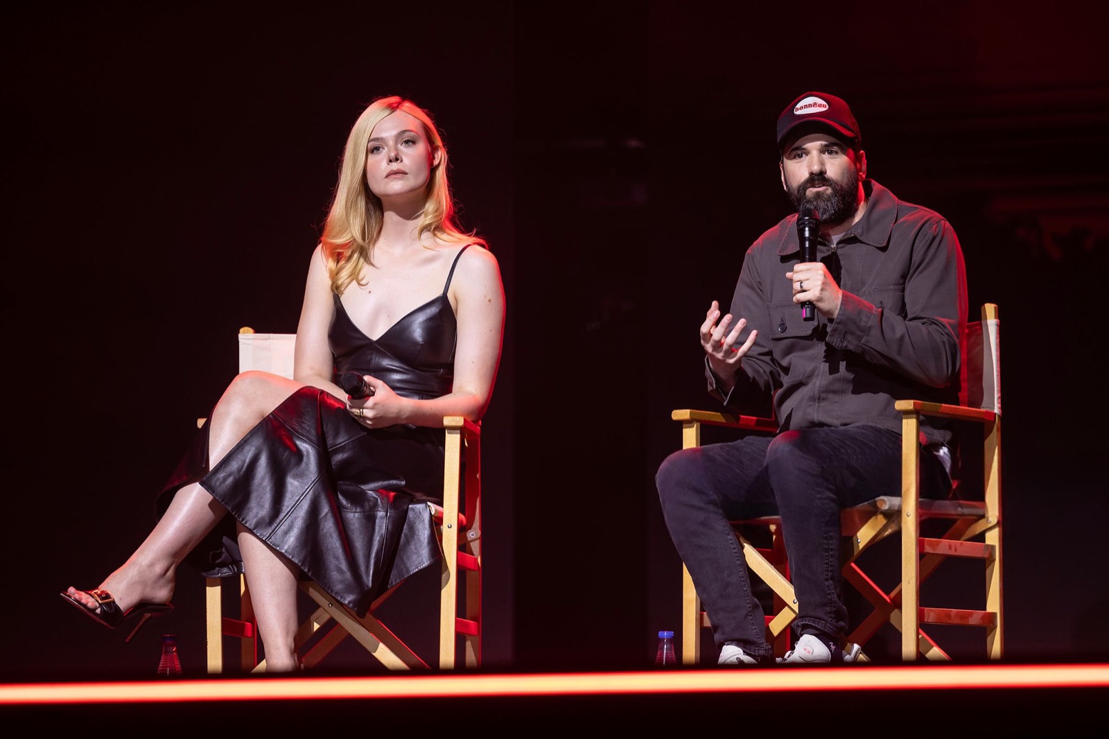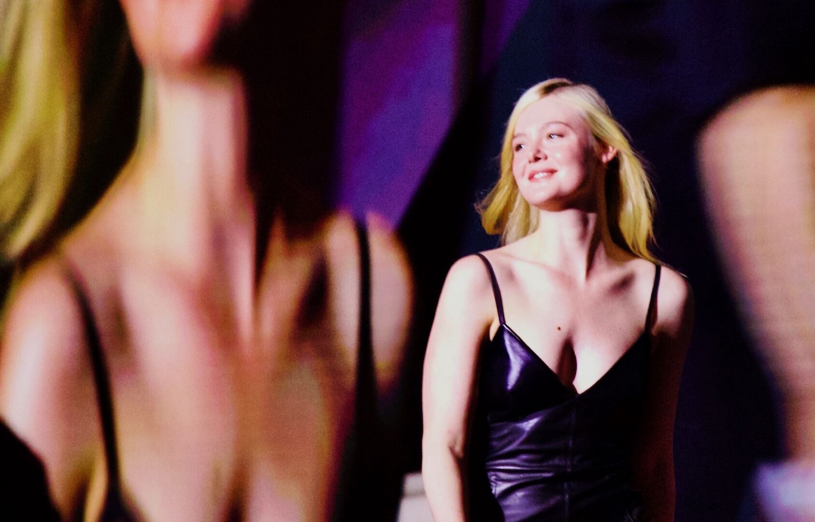 Dans cette robe sombre et fendue, Elle Fanning s’installe comme une panthère mondaine, laissant deviner qu’un micro peut être plus tranchant qu’une griffe.