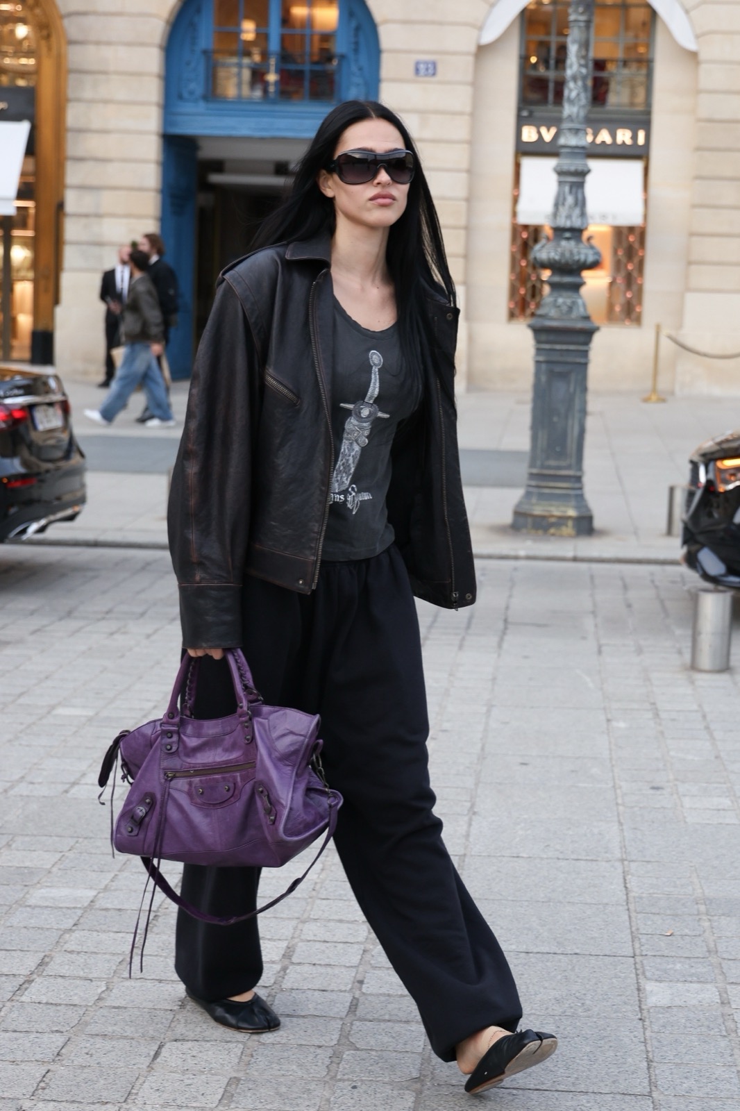 Blouson en cuir, lunettes XXL et allure d’espionne fashion, Amelia transforme la Place Vendôme en décor de film noir où les héroïnes portent du Balenciaga au lieu d’un alibi.