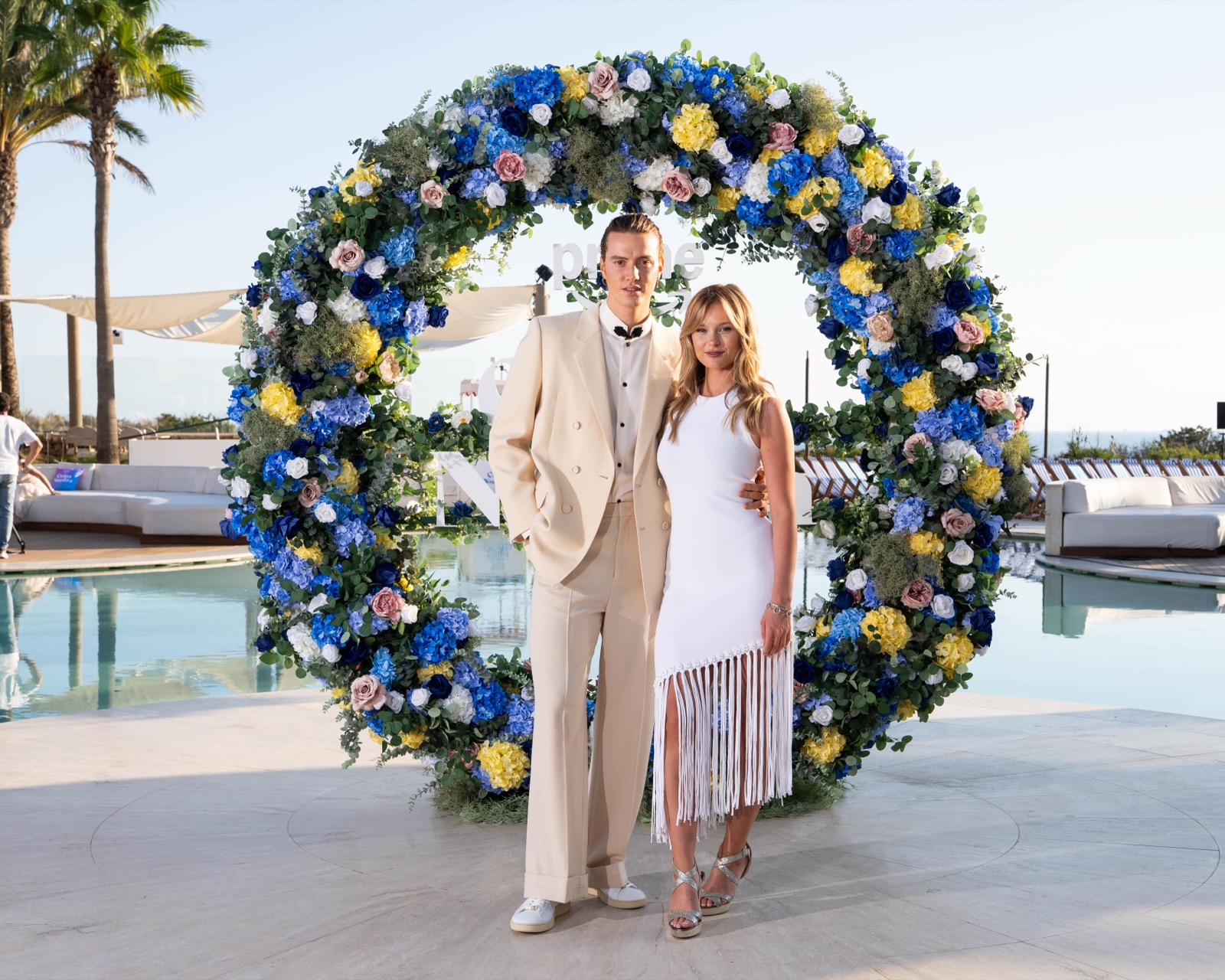 En robe blanche frangée, Mia Jenkins joue les sirènes repenties entre les arcs de fleurs Prime Video et les reflets de piscine. Tout respire le péché… bien mis en scène.