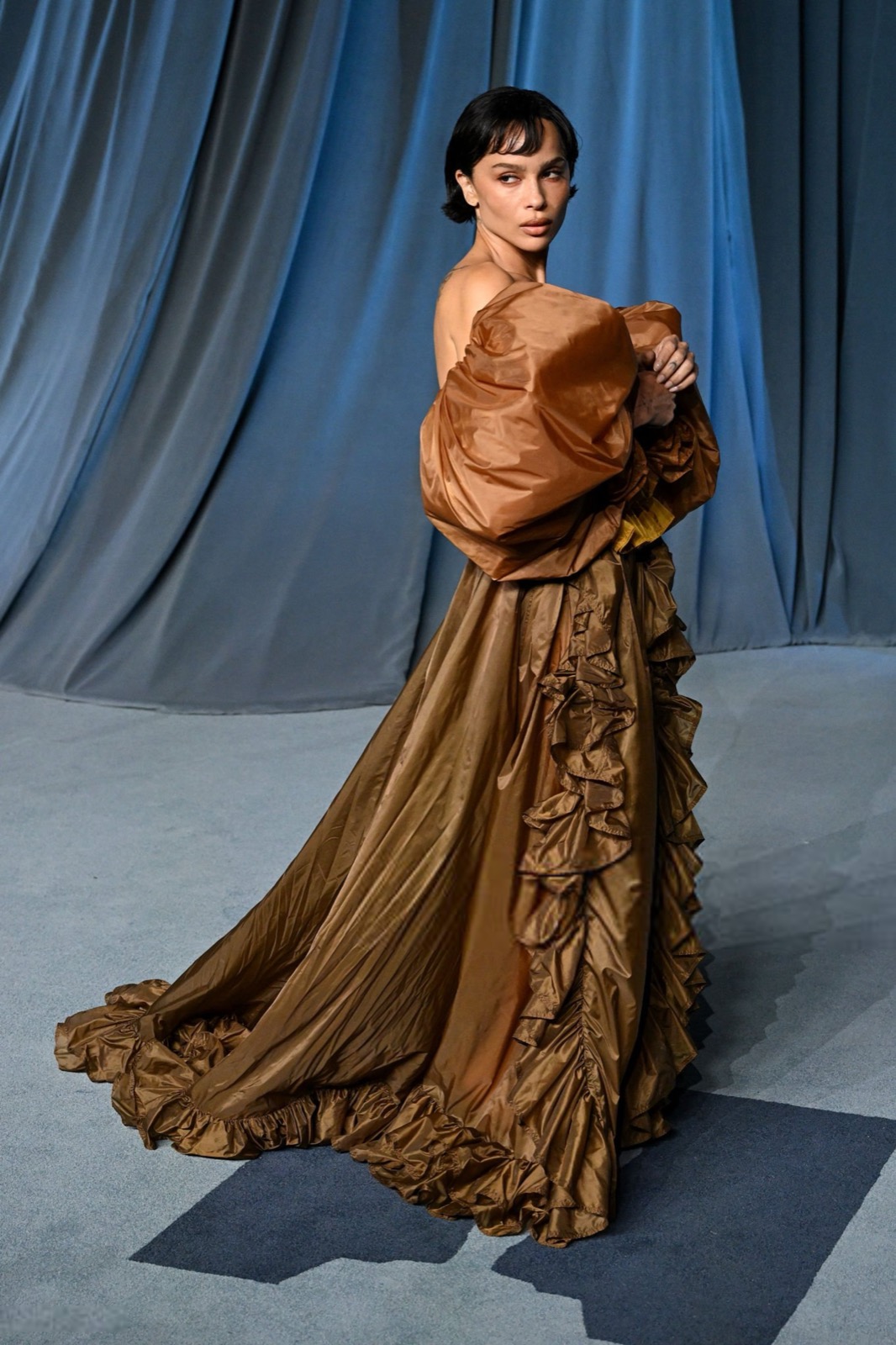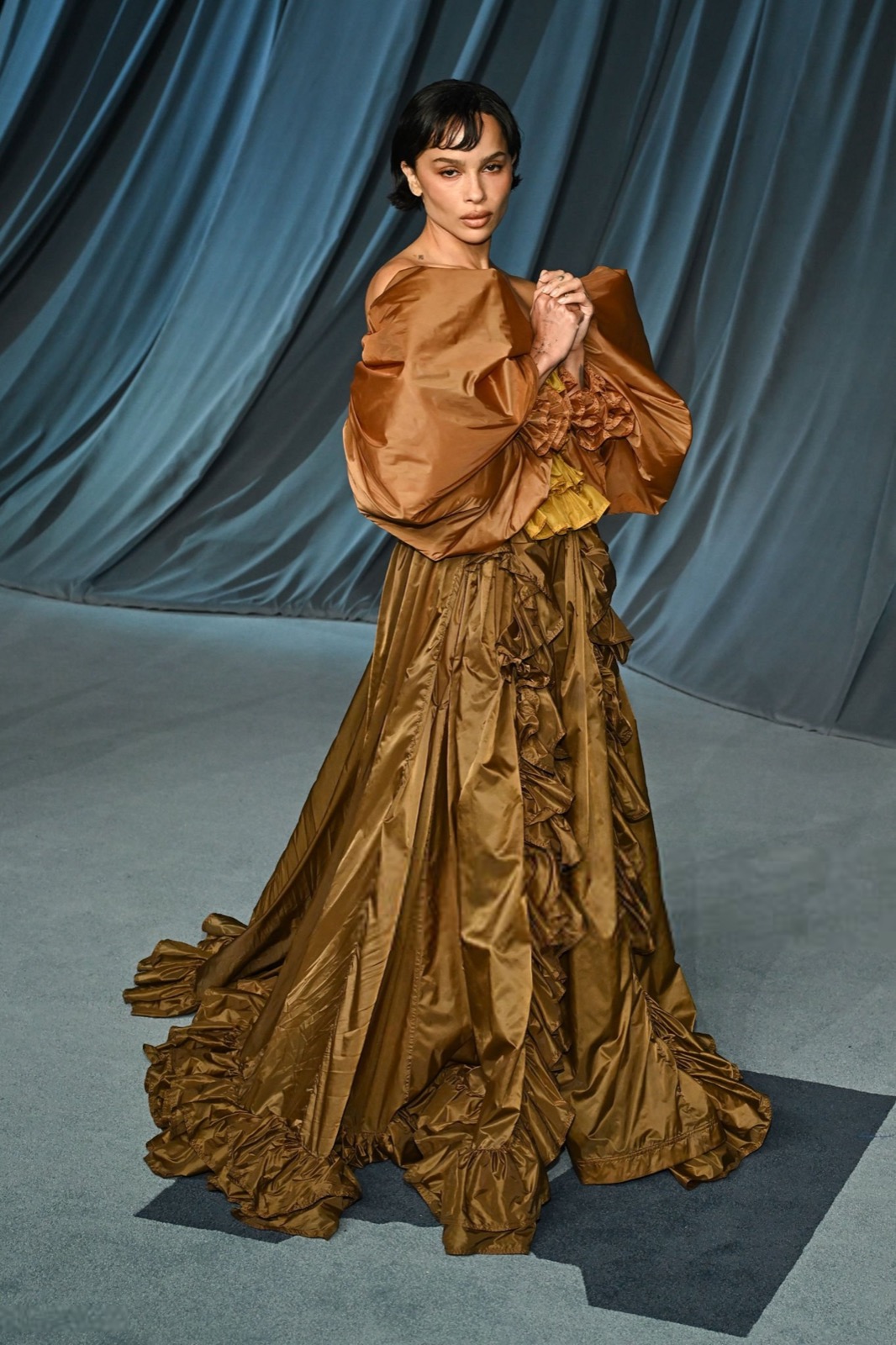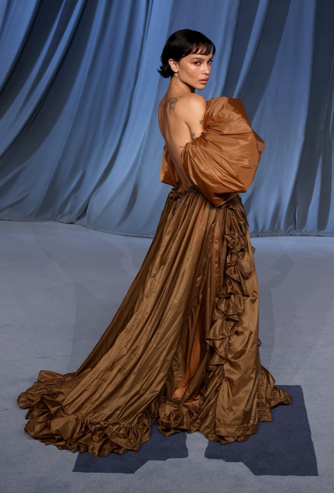 Au 5th Annual Academy Museum Gala, Zoë Kravitz flotte dans une robe couleur caramel, gonflée d’air et de désirs contenus. Ses épaules nues chuchotent à la soie des promesses interdites.