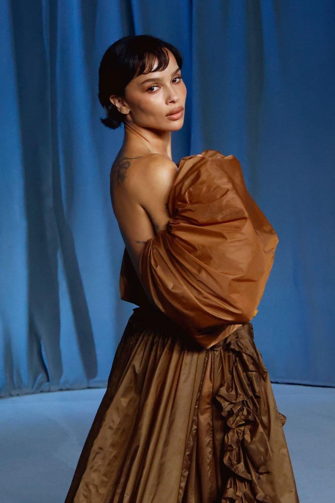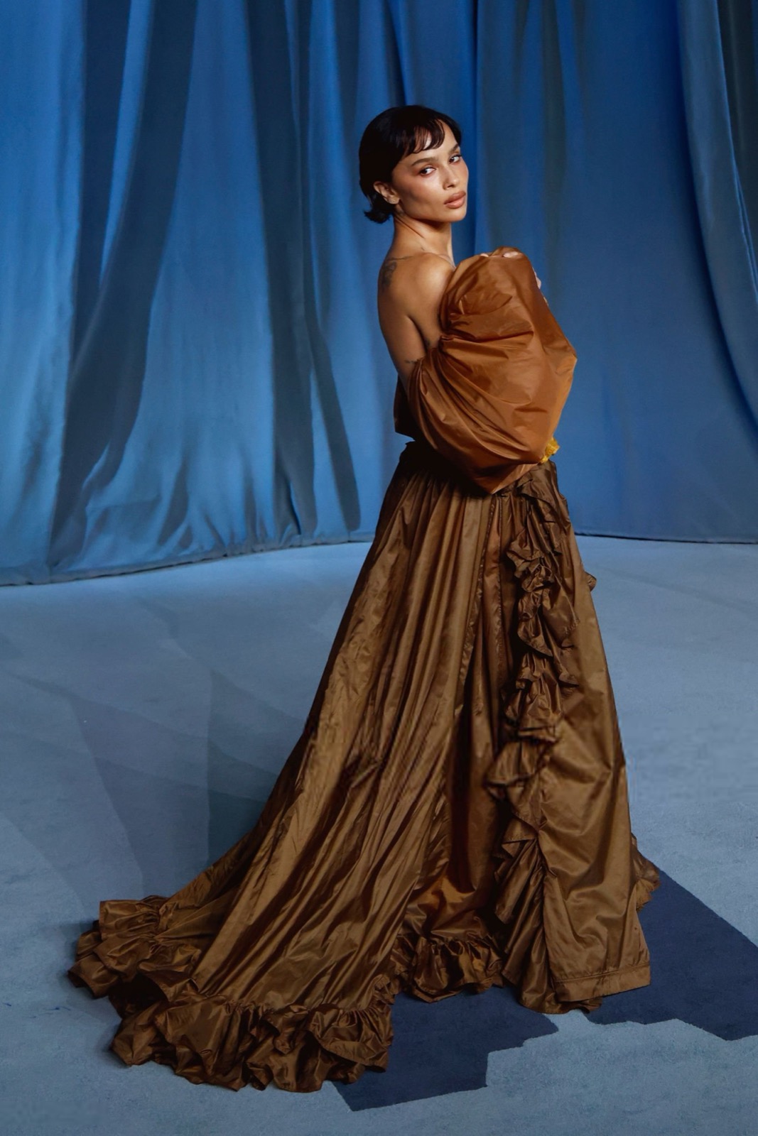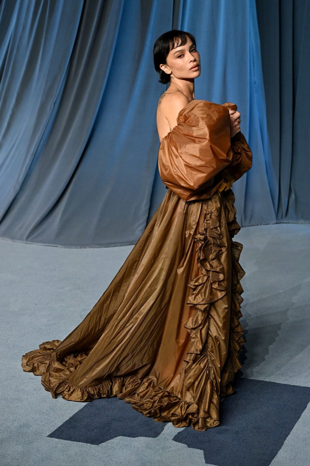 Au 5th Annual Academy Museum Gala, Zoë Kravitz flotte dans une robe couleur caramel, gonflée d’air et de désirs contenus. Ses épaules nues chuchotent à la soie des promesses interdites.