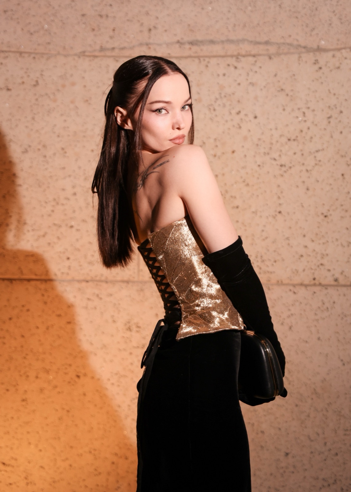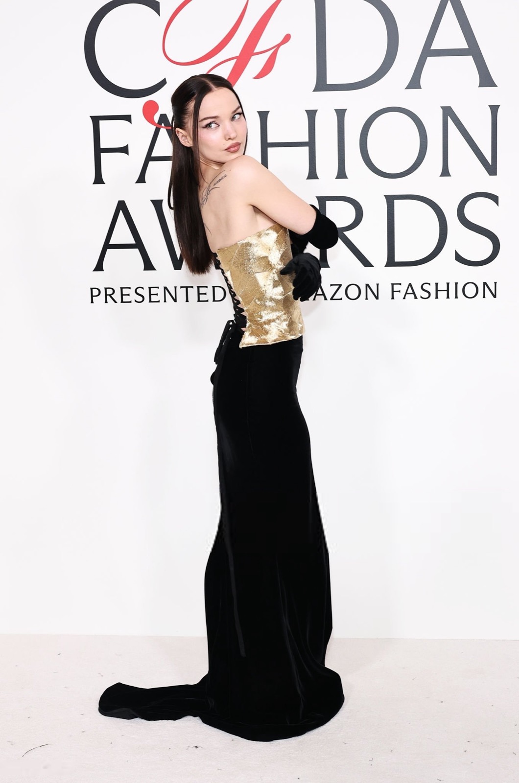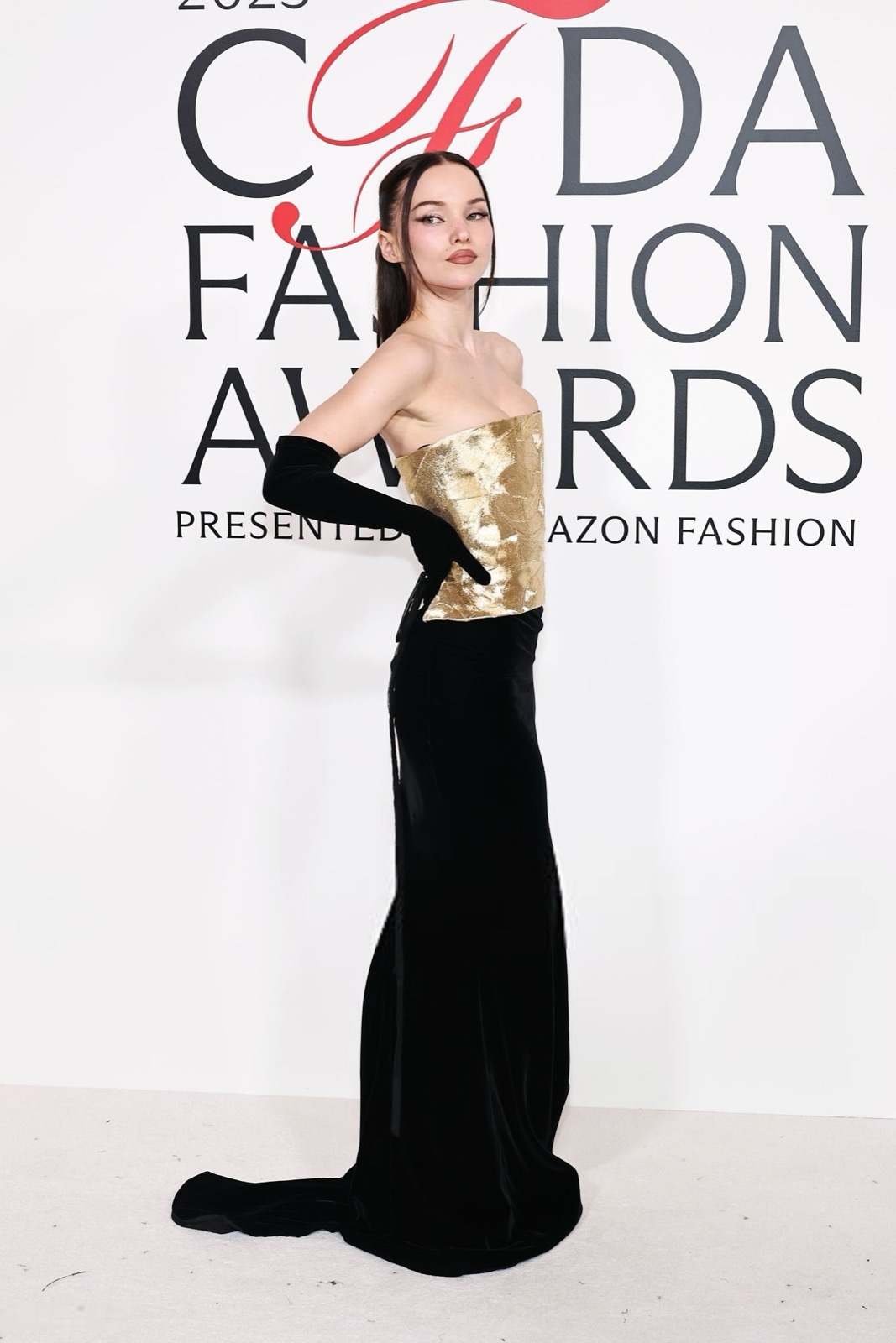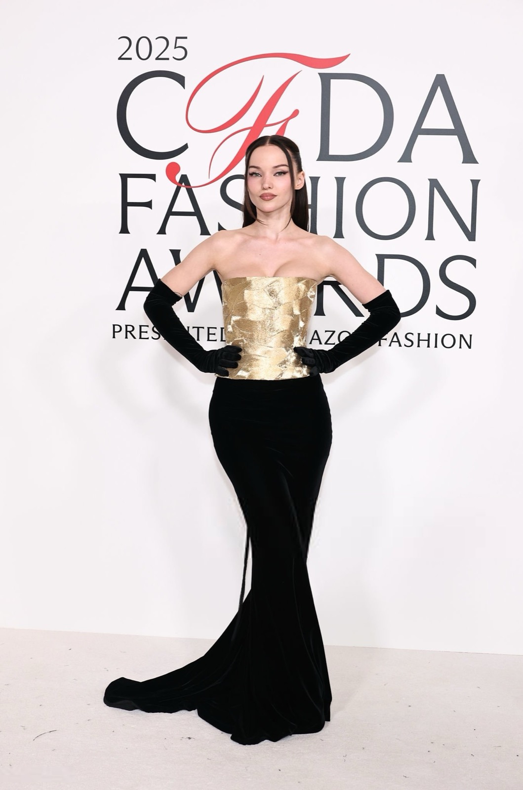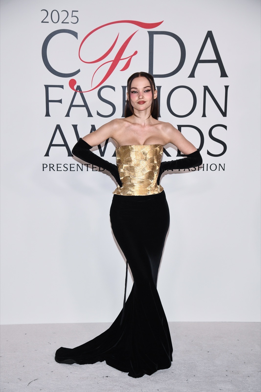 Dove Cameron glisse dans sa robe sirène, corset d’or et velours noir sculptant une anatomie de péché. Tout semble calculé : le port altier, la moue fatale, le gant long comme promesse.
