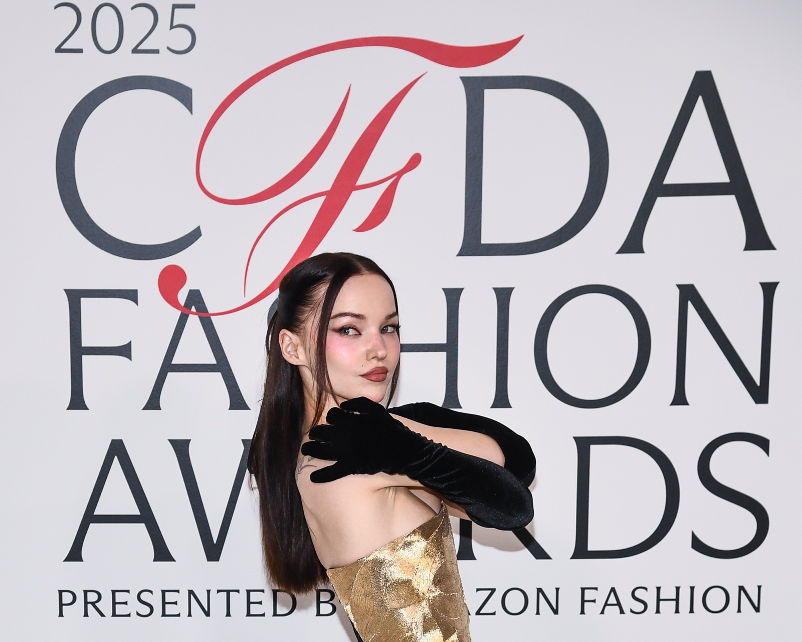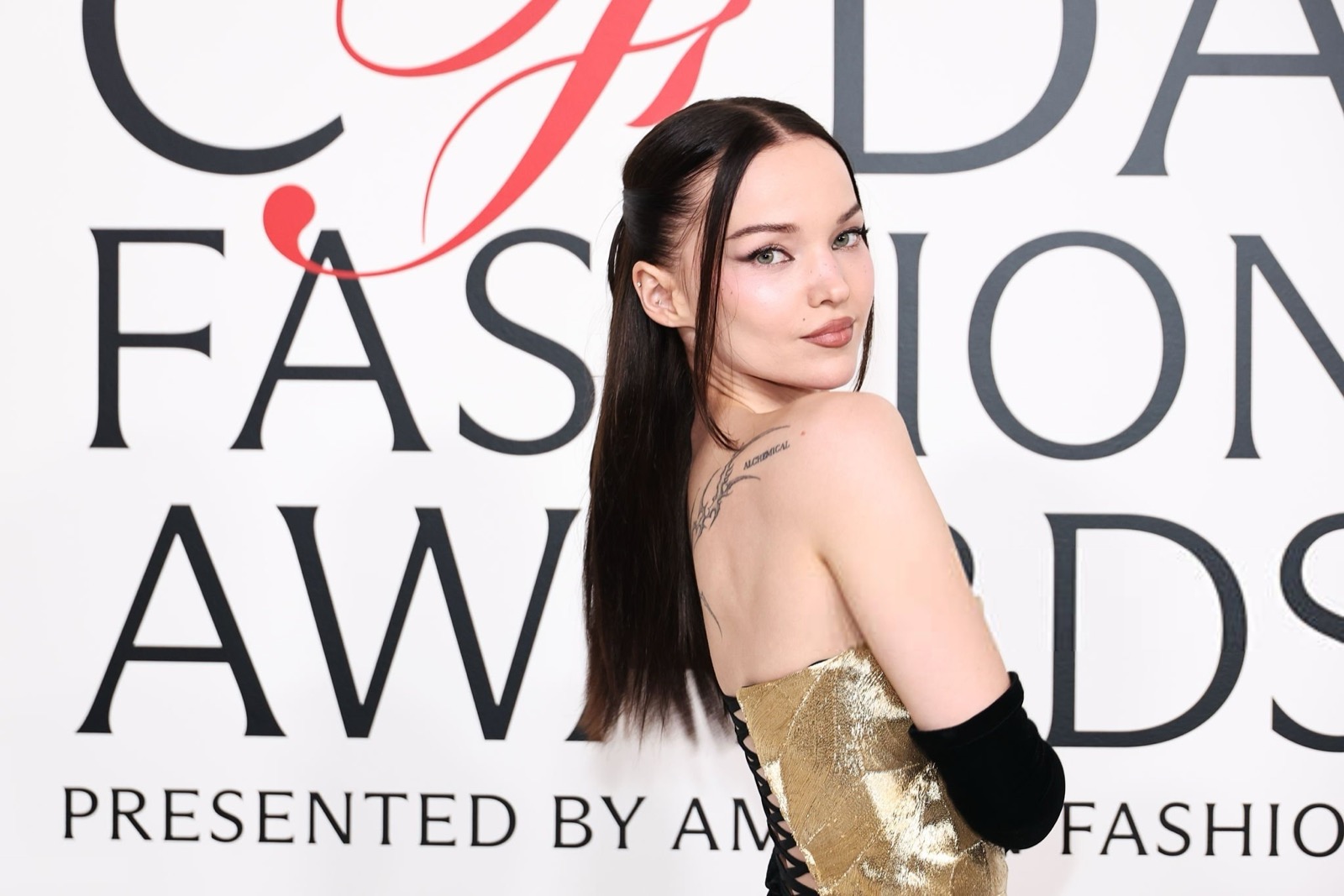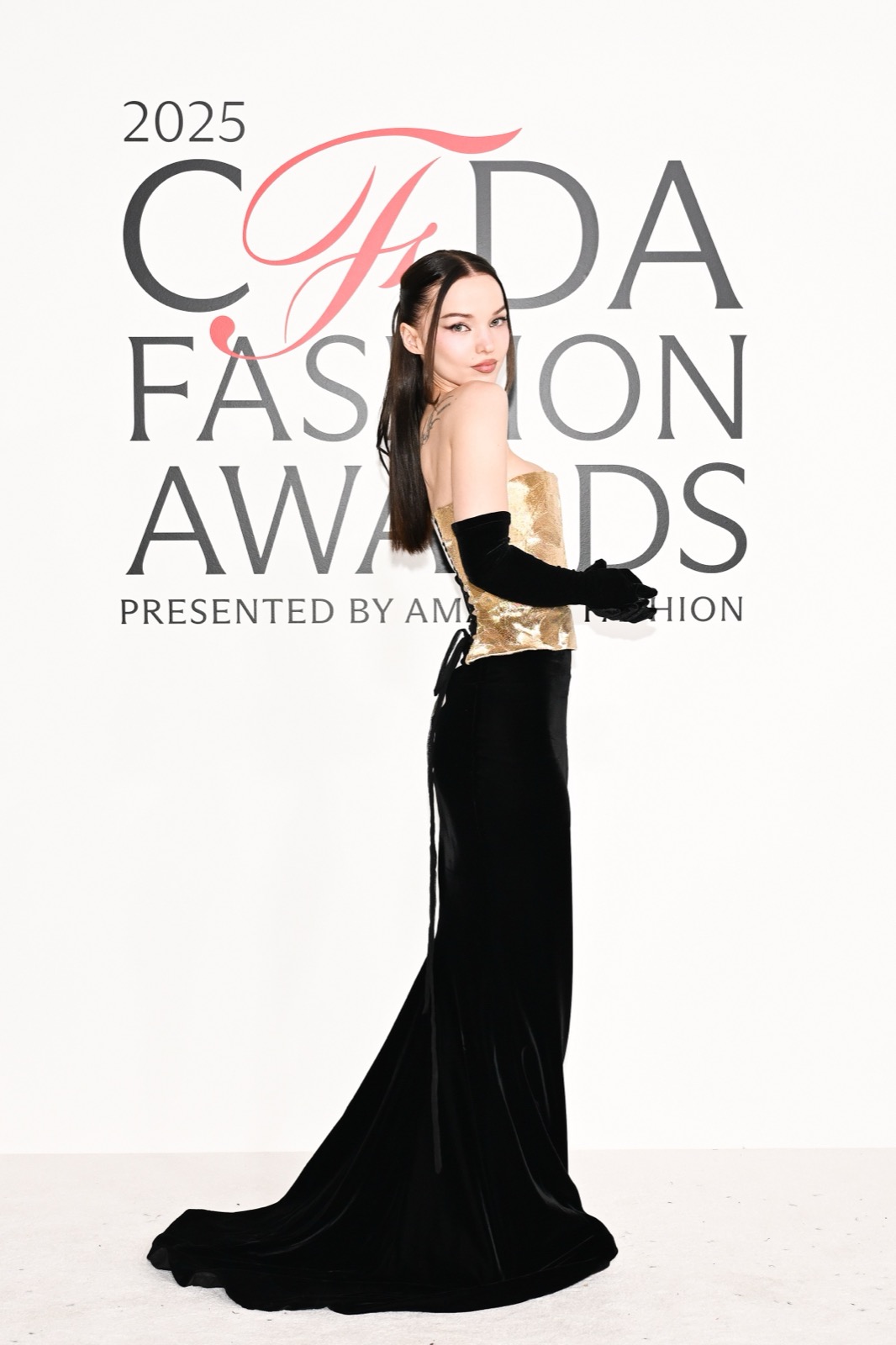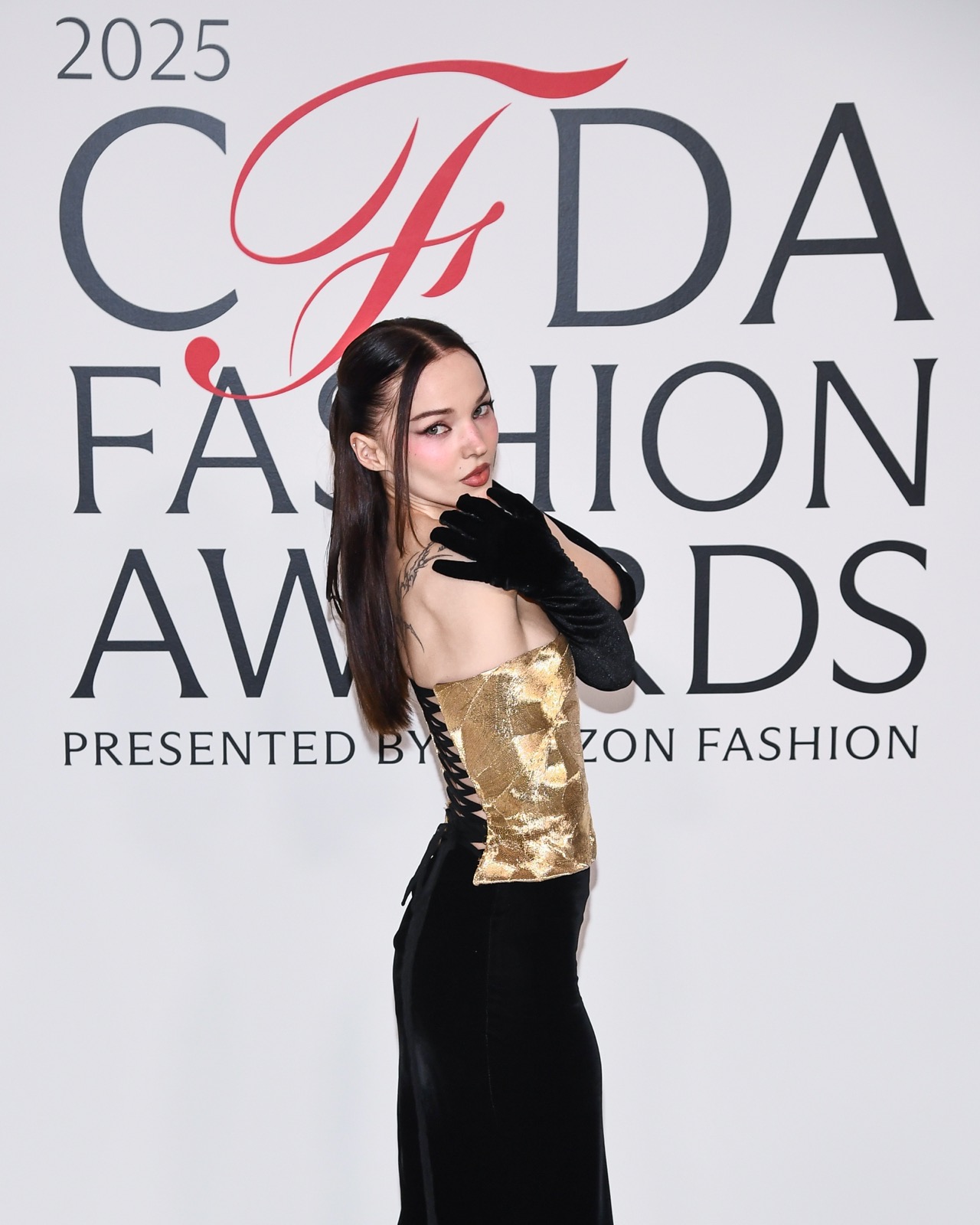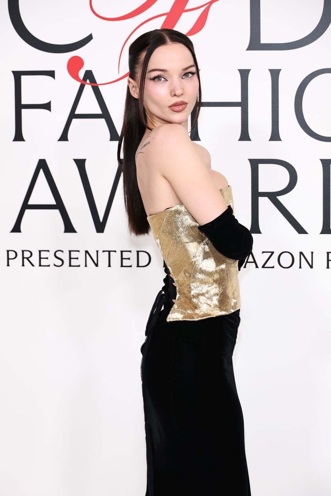 Dove Cameron glisse dans sa robe sirène, corset d’or et velours noir sculptant une anatomie de péché. Tout semble calculé : le port altier, la moue fatale, le gant long comme promesse.