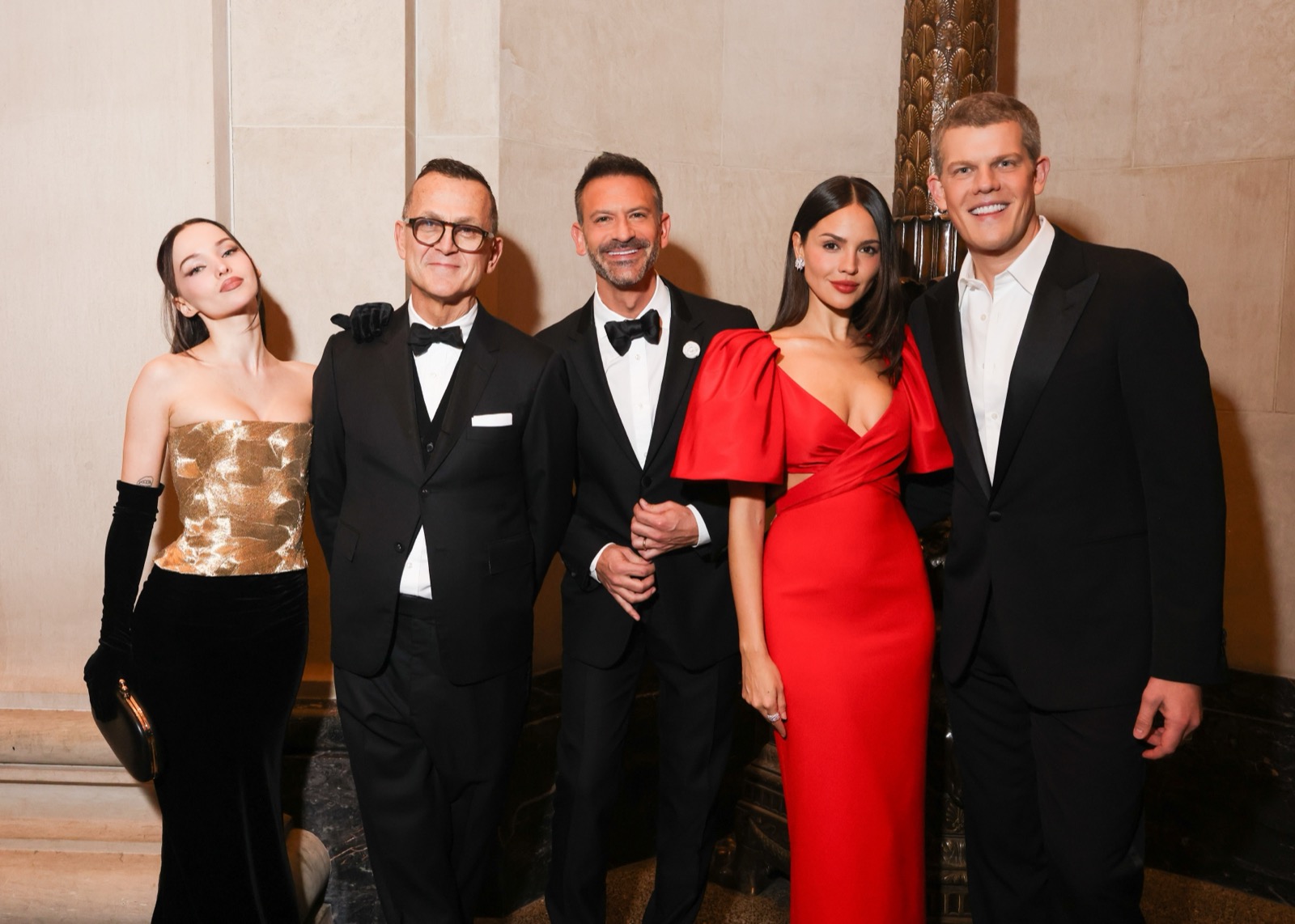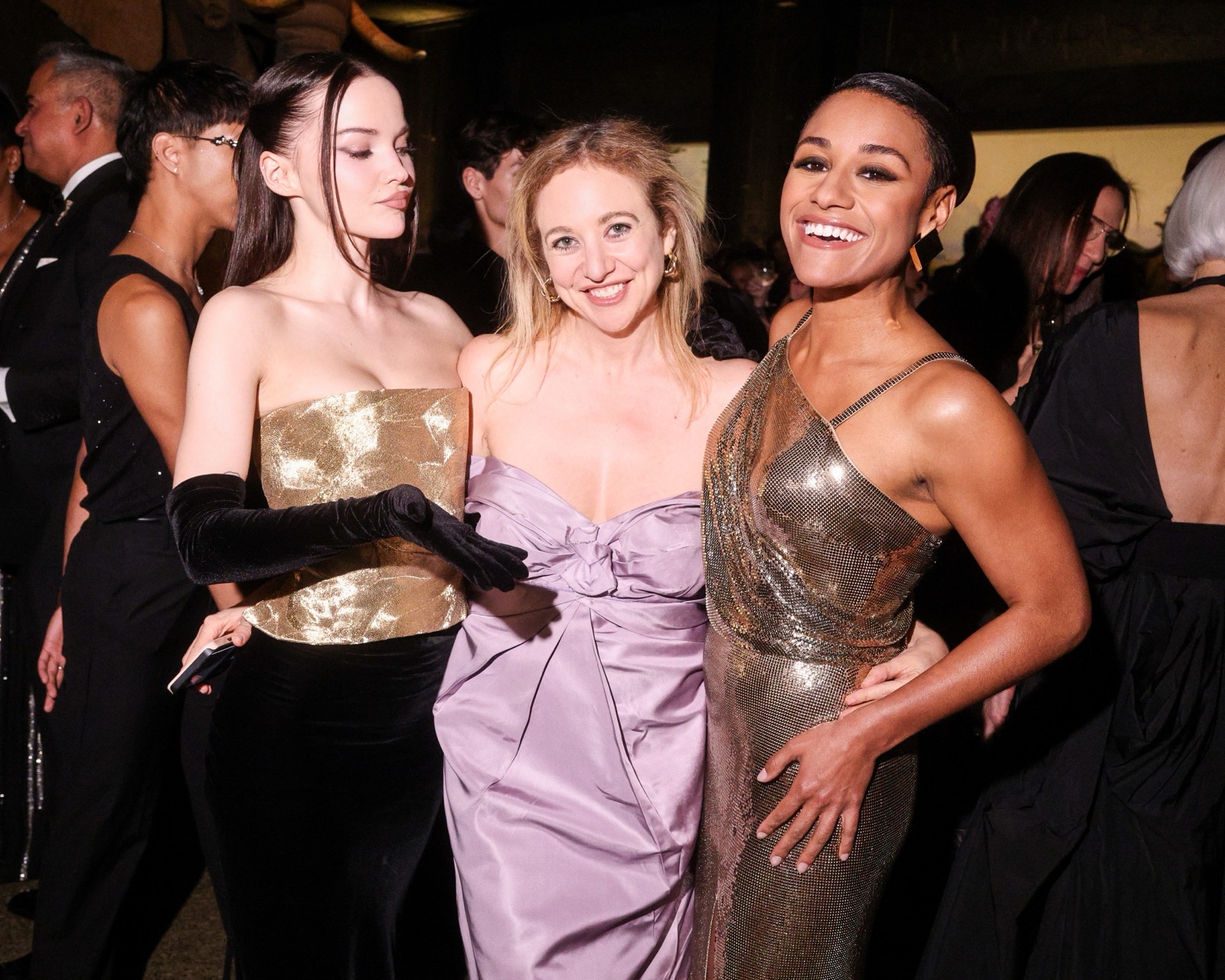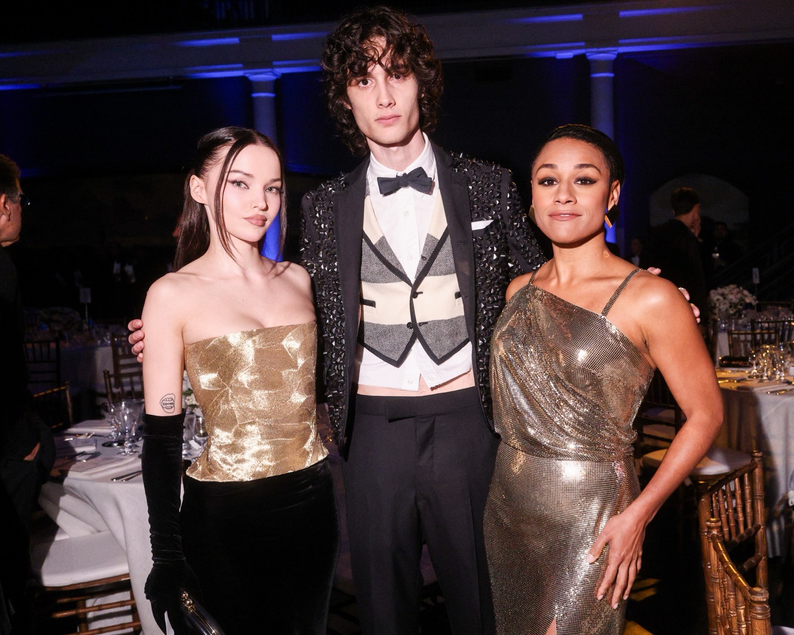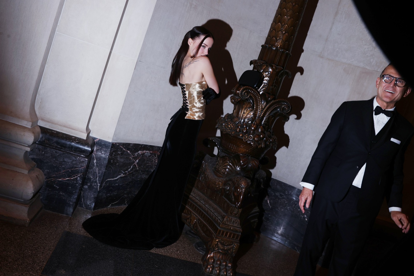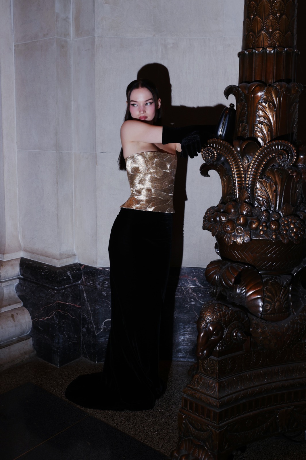 Dove Cameron glisse dans sa robe sirène, corset d’or et velours noir sculptant une anatomie de péché. Tout semble calculé : le port altier, la moue fatale, le gant long comme promesse.