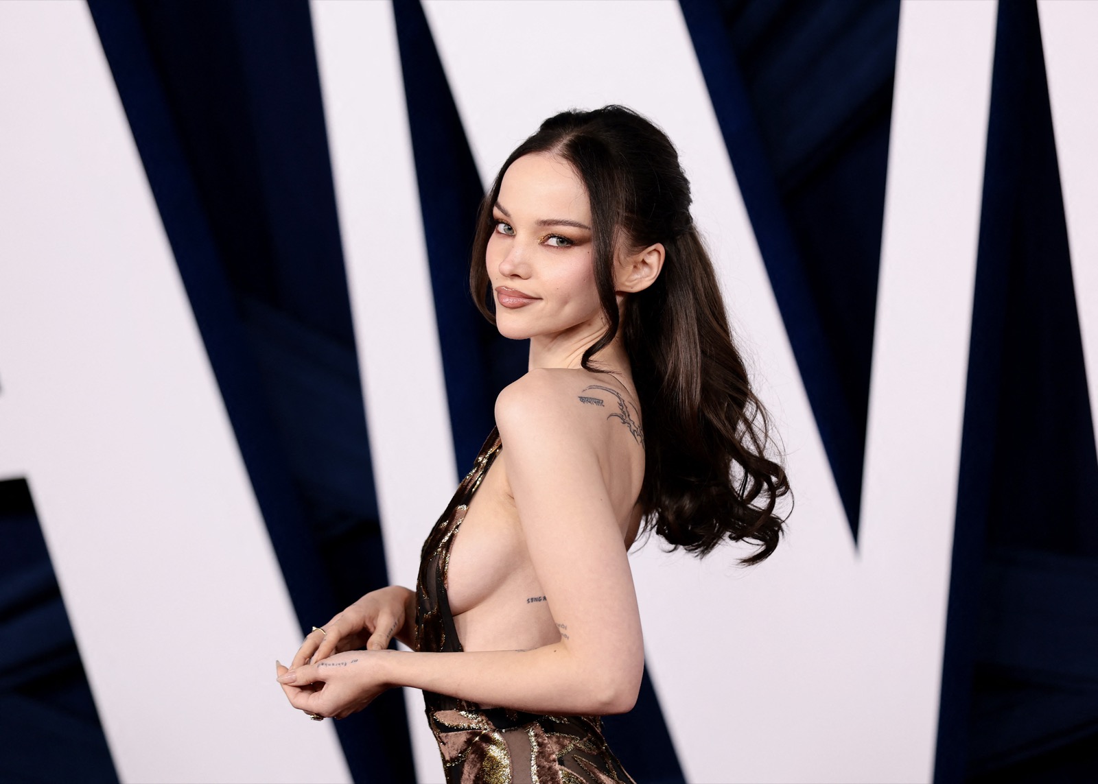 Dove Cameron s’avance sur le tapis rouge des Glamour Women of the Year Awards comme une sirène échappée d’un rêve vénéneux. Sa robe bronze et or avale la lumière, sa peau la renvoie comme un défi sensuel aux bonnes manières.