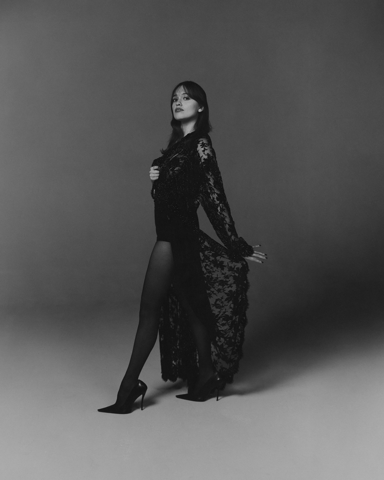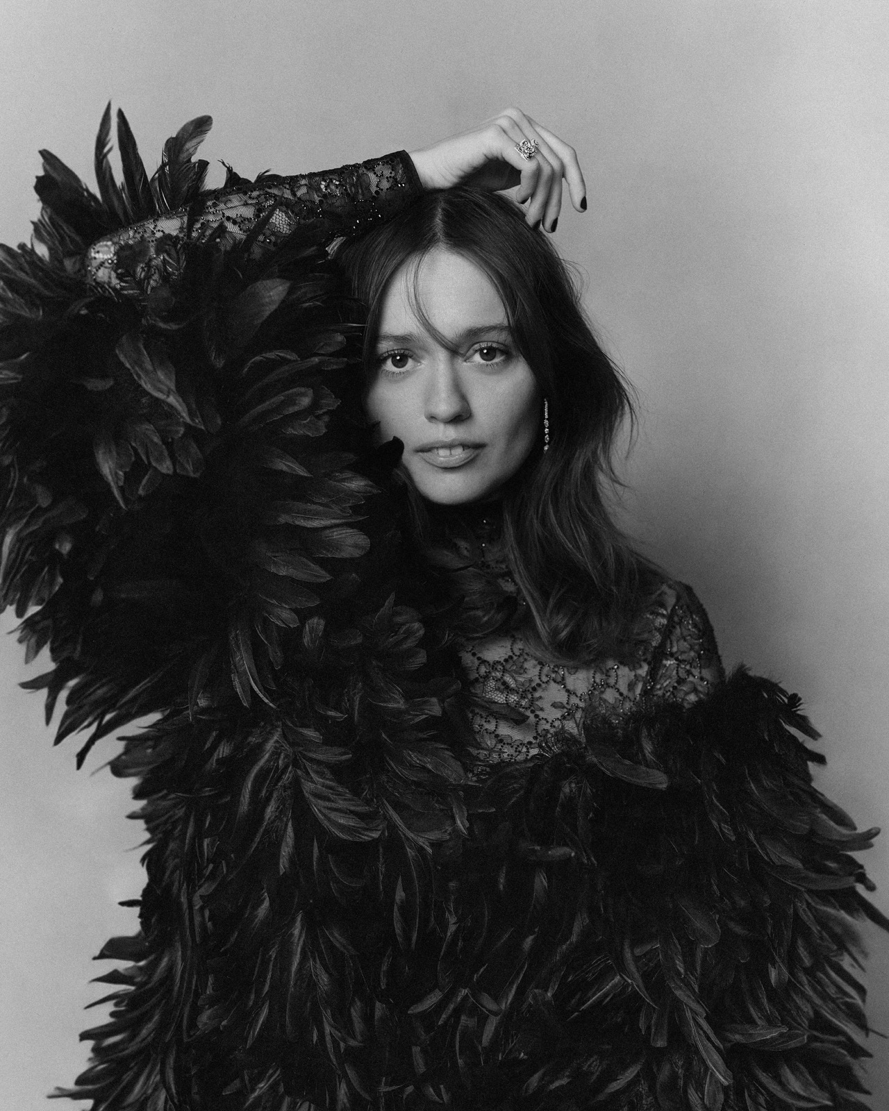 Pour Harper’s Bazaar UK, Aimee Lou Wood délaisse l’ingénue de Sex Education pour une déesse fatale, enveloppée de plumes et de soupirs. Dans ce théâtre de soie noire, chaque mouvement semble un aveu, chaque ombre une caresse.