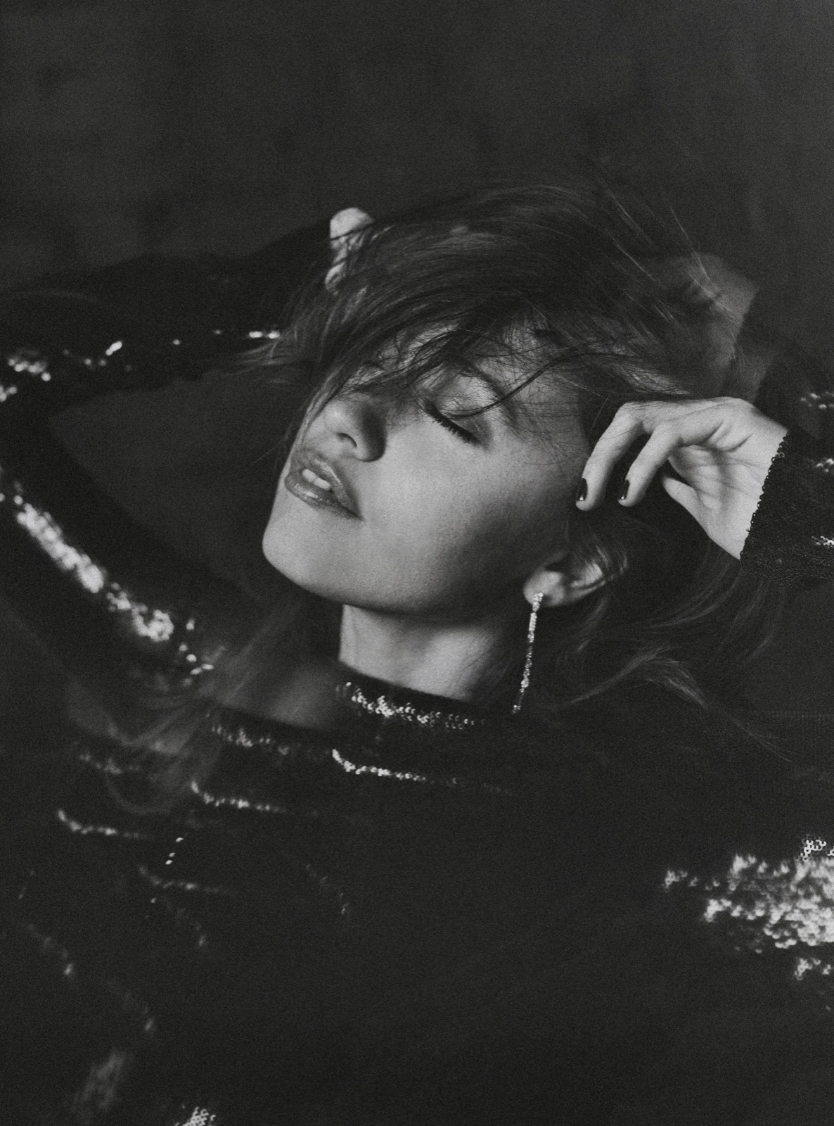 Photographiée entre clair-obscur et vertige, elle joue la sensualité conceptuelle : mi-ange, mi-démon, oscillant entre effronterie et élégance victorienne. Le noir devient sa signature, la lumière, son complice coupable.