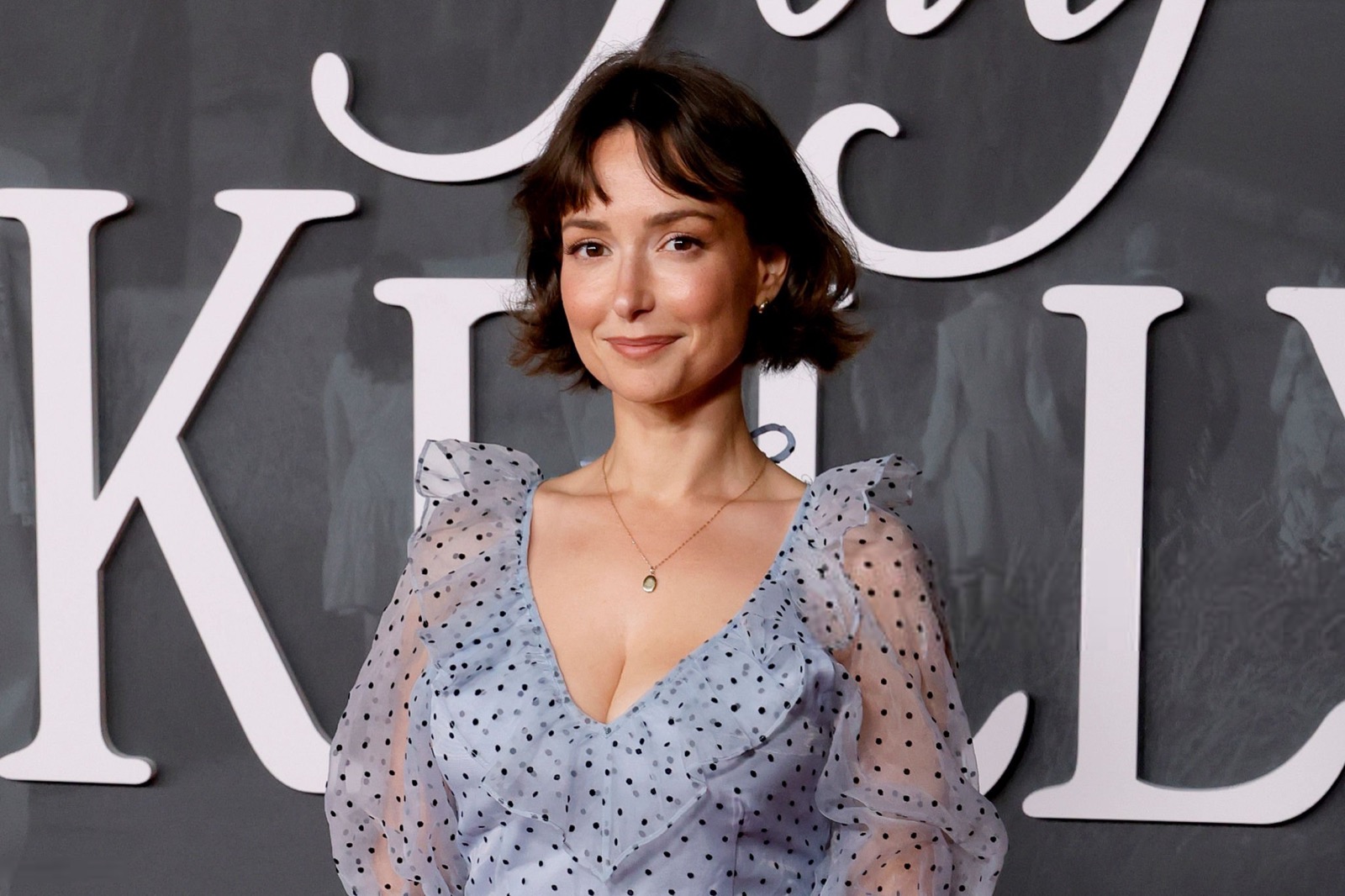 Dans sa robe bleutée à pois, elle avance avec ce calme redoutable qui fait vaciller les objectifs. Le look semble sage, mais sa précision millimétrée fait comprendre qu’elle sait parfaitement ce qu’elle fait.