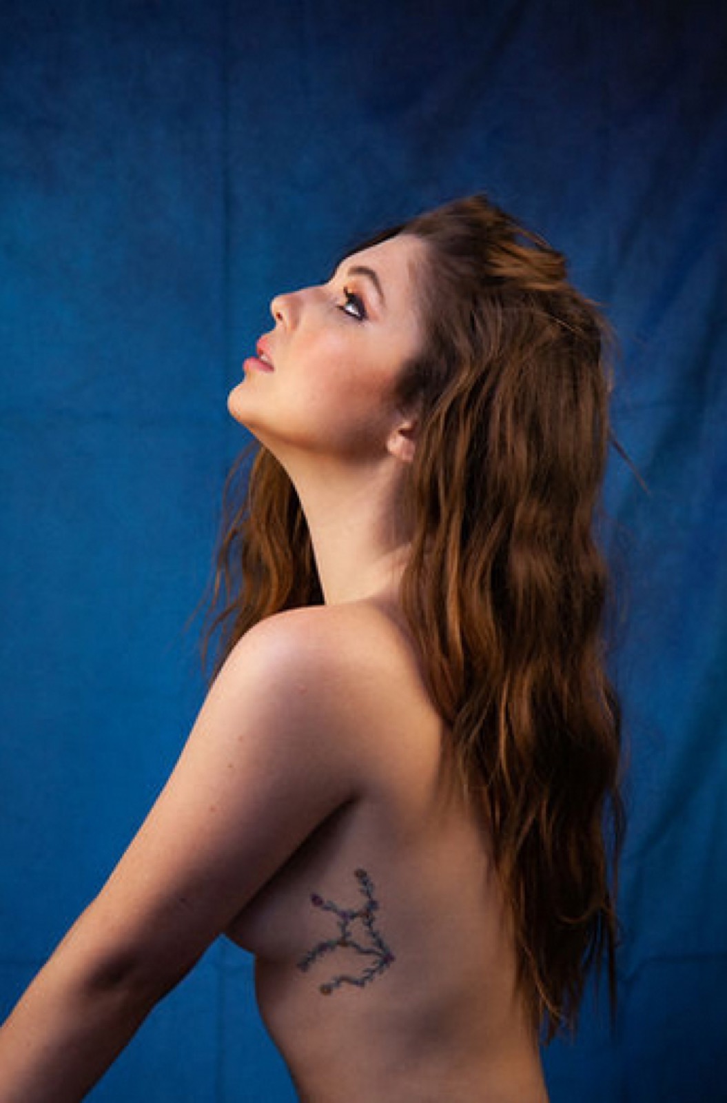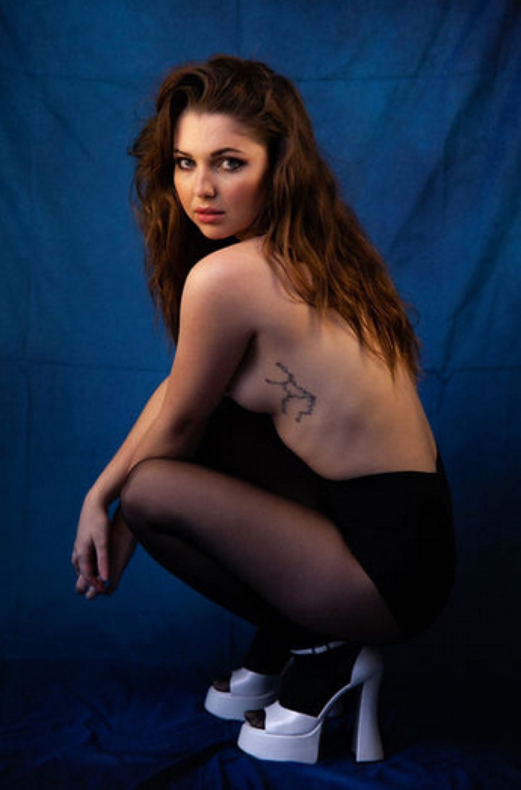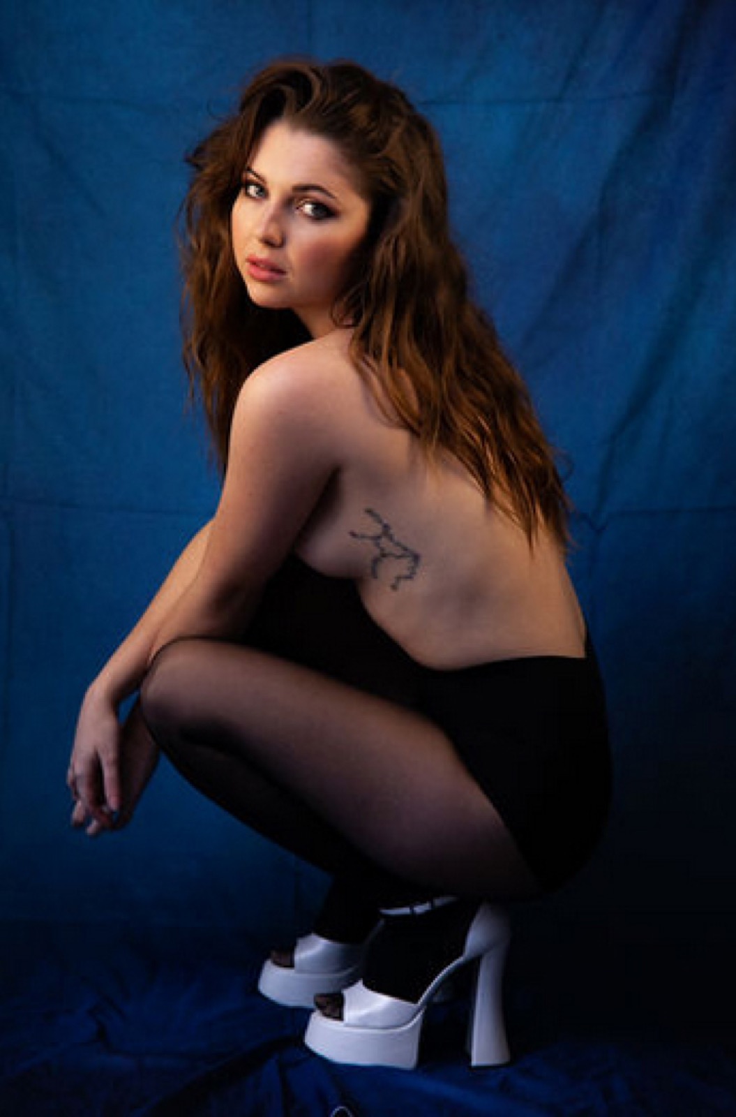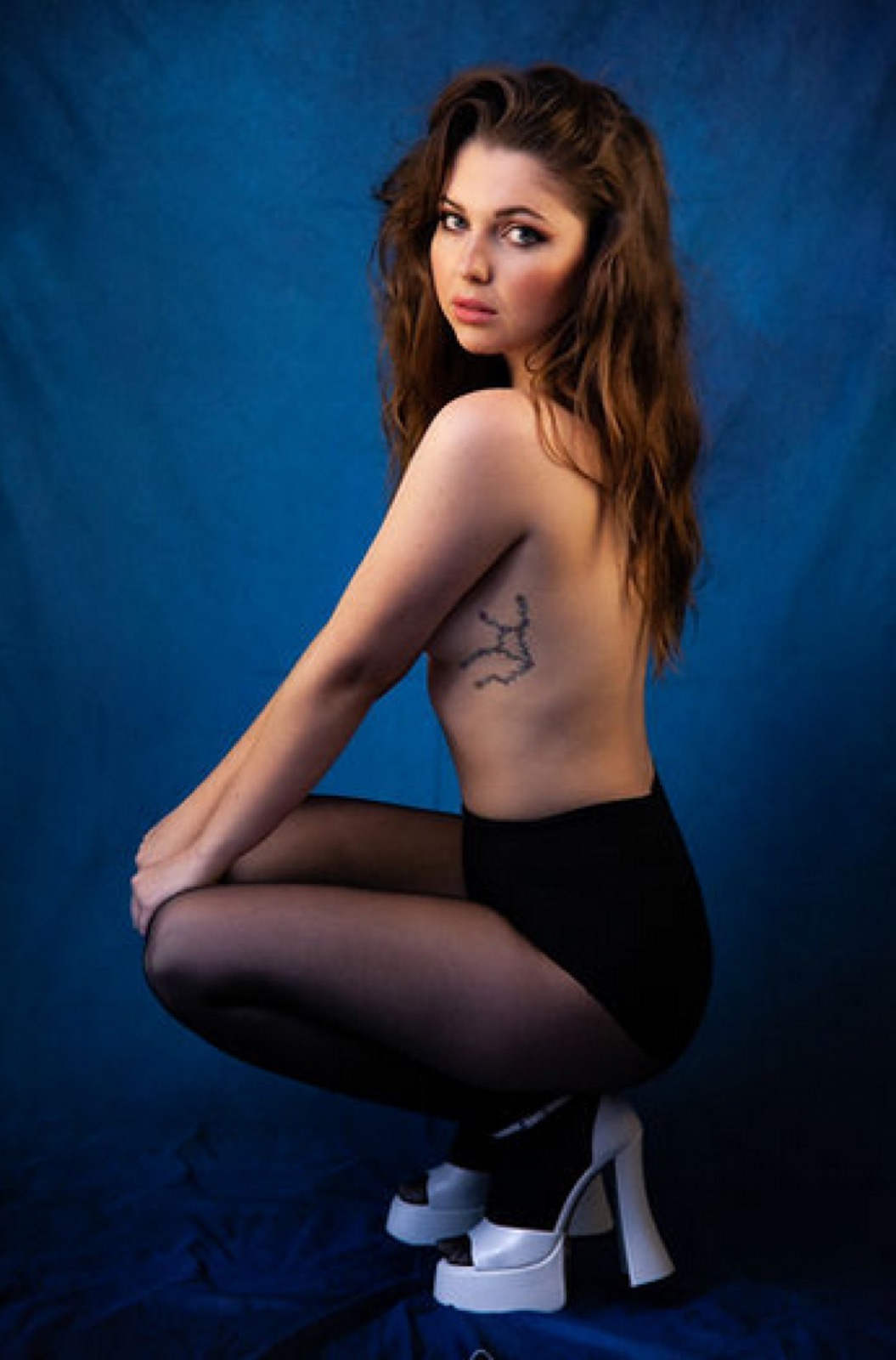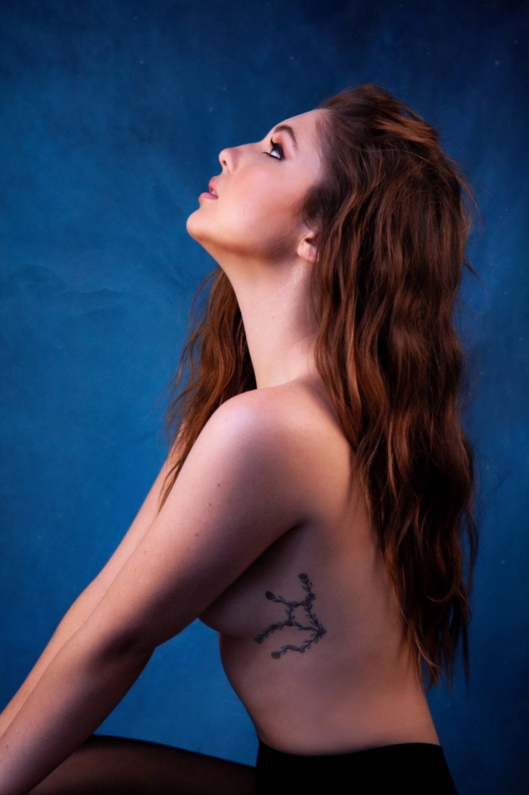 Sammi Hanratty topless en rébellion contrôlée dans un studio bleu