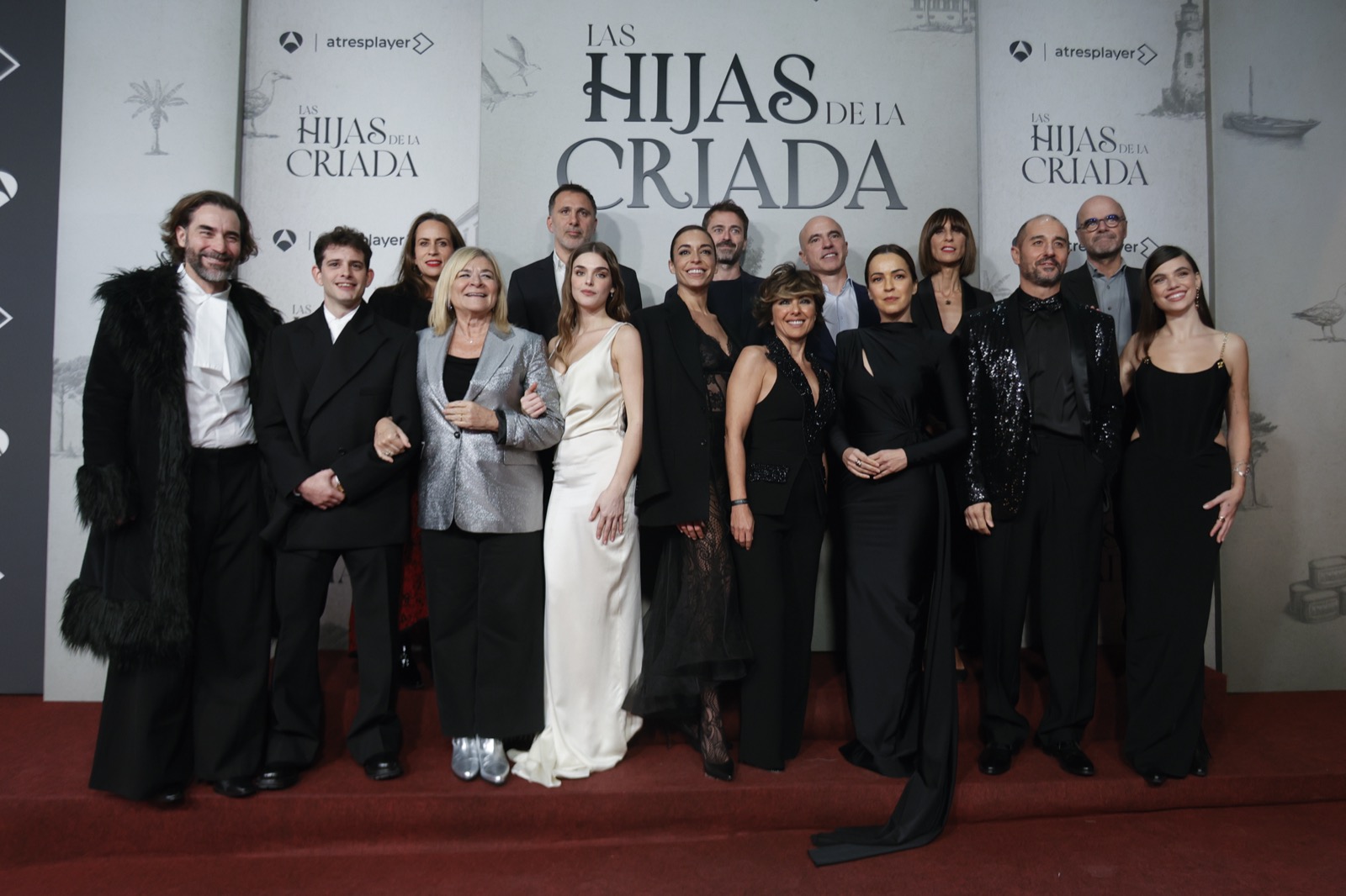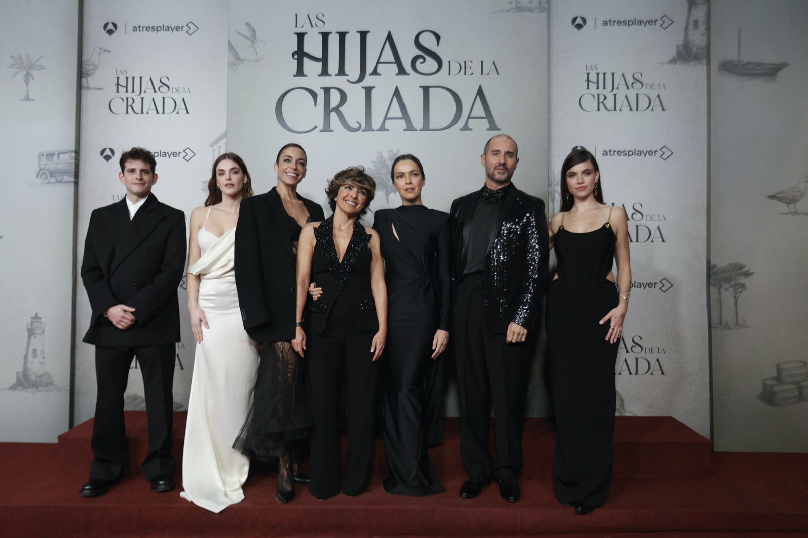 Au Callao Cinema, elle apparaît en robe ivoire, tissu qui file comme du satin et tranche avec le décor rétro de la première de Las Hijas De La Criada.