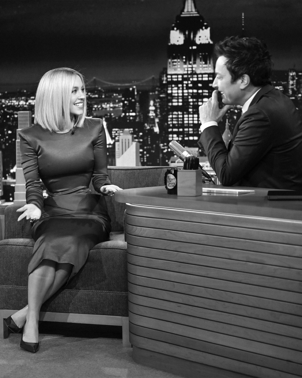 Assise face à Jimmy Fallon, elle croise les mains avec l’air d’une femme prête à offrir la meilleure punchline de sa vie. Lui ? Il essaie juste de ne pas perdre le fil en regardant la robe. Bonne chance.