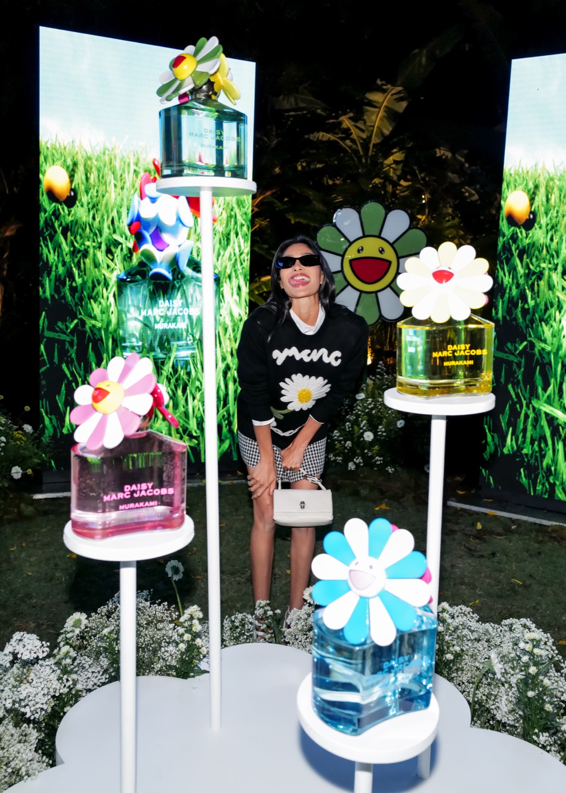 Pritika Swarup traverse ce jardin pop comme une héroïne trop chic pour cueillir une marguerite. Son pull fleur géante claque plus fort que toutes les installations lumineuses autour.