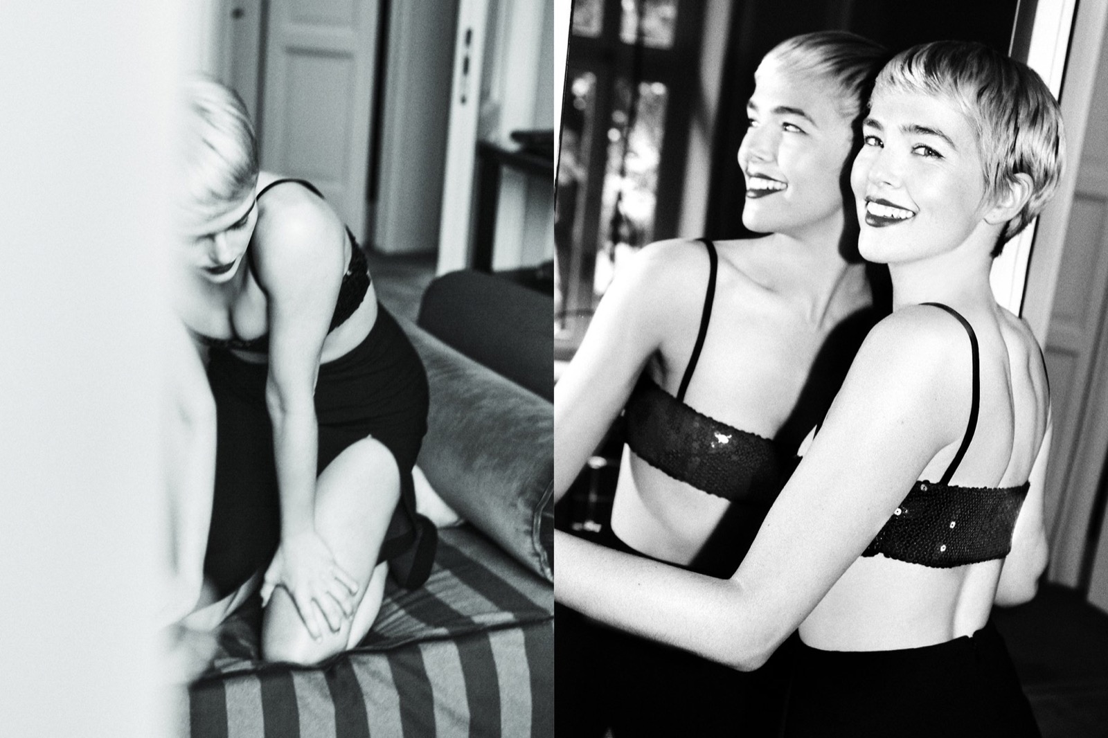 Le noir et blanc serre le cadre, le miroir double le jeu, le corps se replie sans jamais se cacher. Pas de pose aimable, juste une tension élégante, parfaitement assumée.
