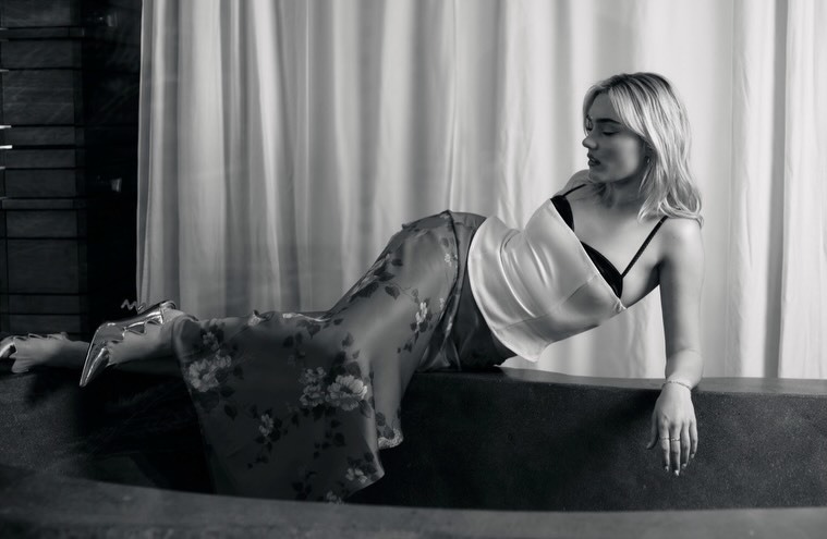 Meg Donnelly s’affale chic dans un fauteuil crème, regard blasé, robe fluide qui fait semblant d’obéir. Le décor murmure MAG, elle répond flemme luxueuse.