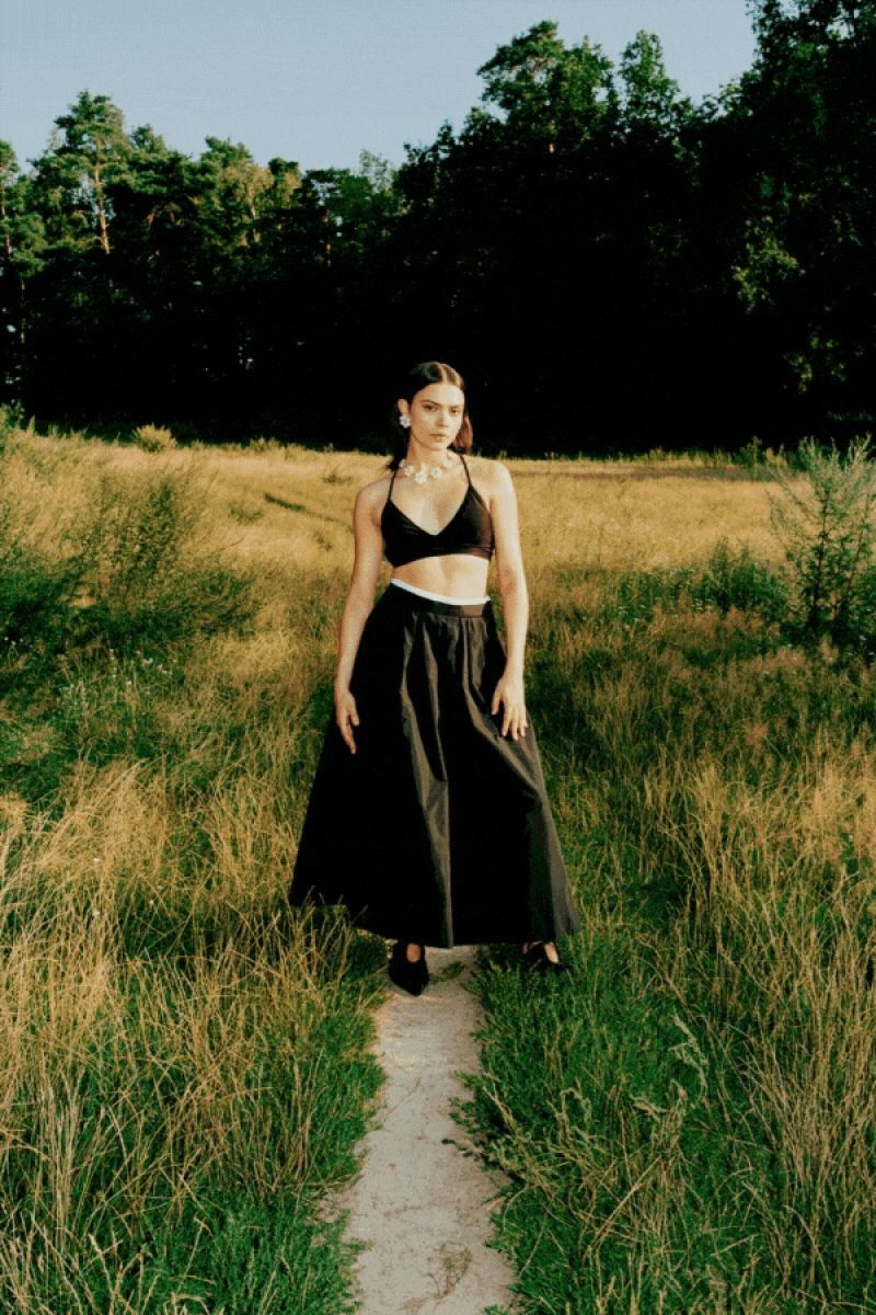 Harriet Herbig-Matten transforme un champ banal en terrain de jeu conceptuel pour BLONDE. Silhouette graphique, jambes gainées, regard sérieux : l’innocence est restée au vestiaire.