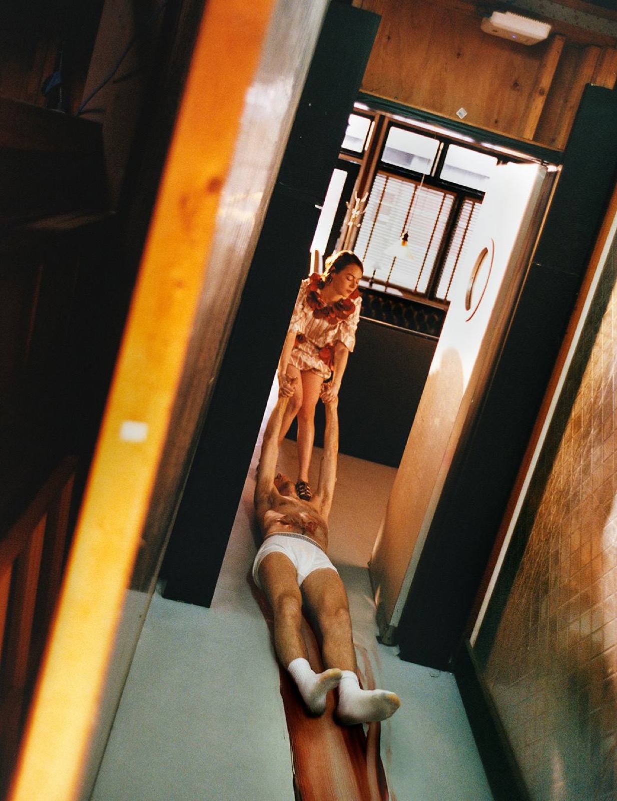 Dans les coulisses, on imagine Emma Stone traînant un corps en chaussettes, méthode Pilates du chaos. Le shooting vend l’illusion cinéma : sérieux affiché, absurde assumé, caméra partout. C’est W Magazine : on promet du prestige, on livre une blague visuelle parfaitement cadrée.