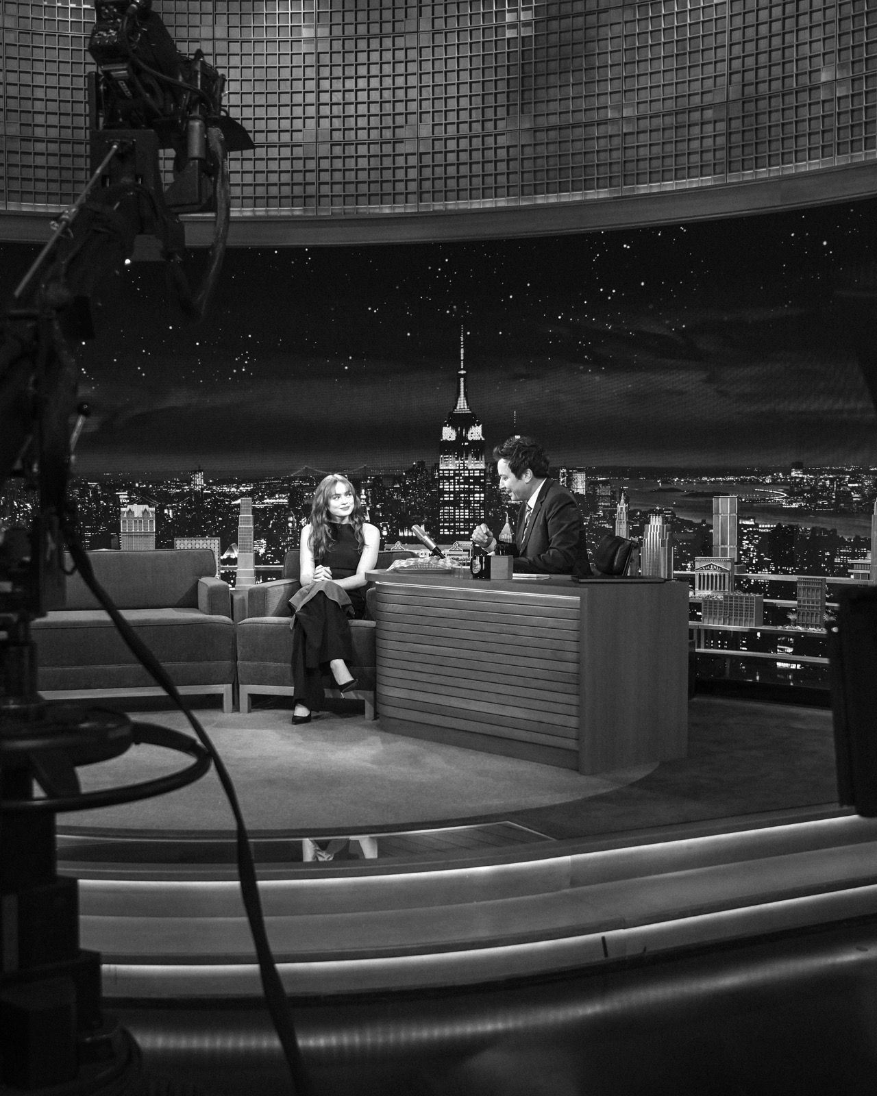 Sadie Sink arrive au The Tonight Show starring Jimmy Fallon en robe noire ultra-sage, posture d’élève modèle convoquée chez le proviseur. Dos droit, mains croisées, sourire poli : on dirait qu’elle attend la question piège sur son film sans renverser la table basse.