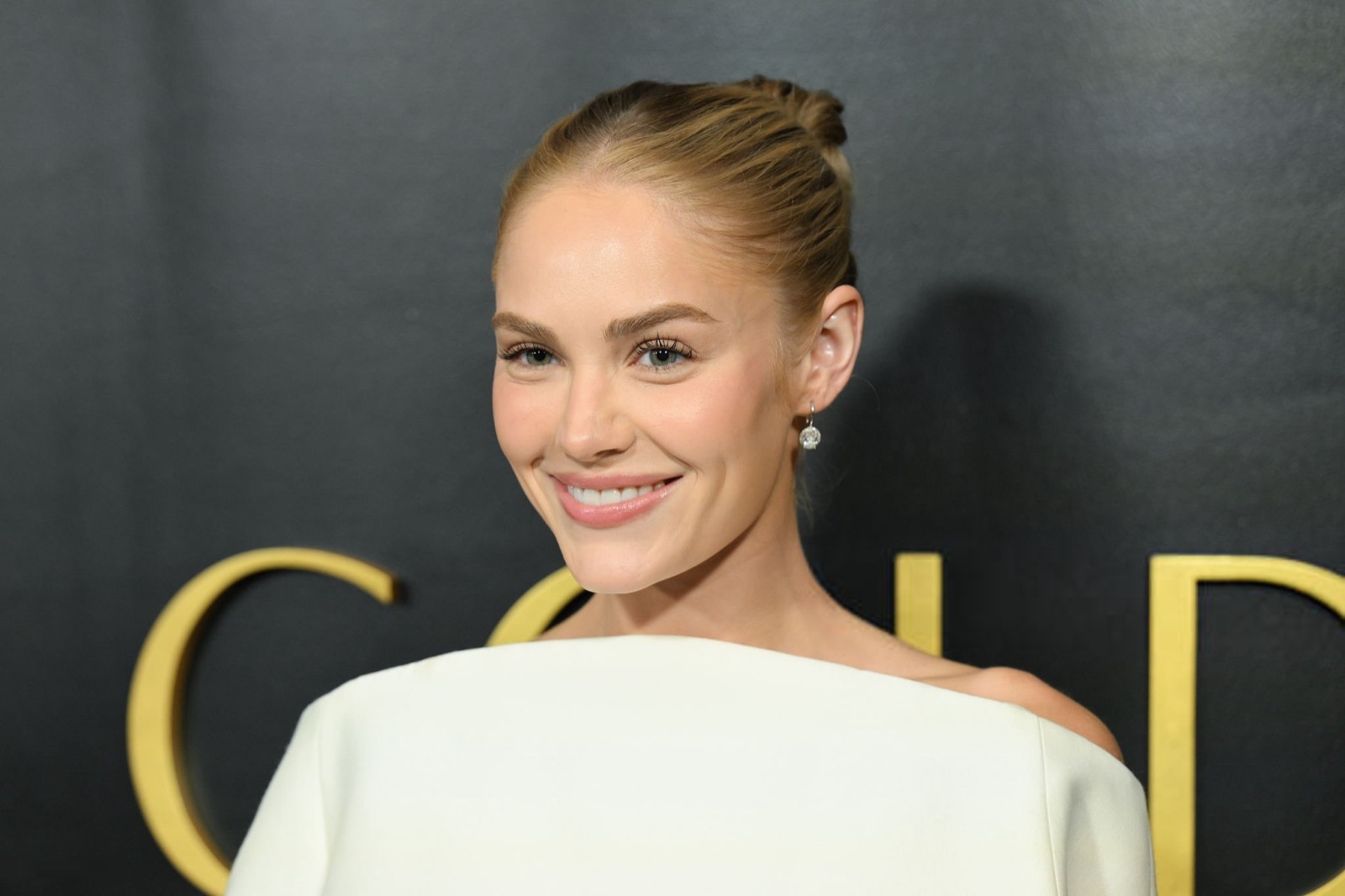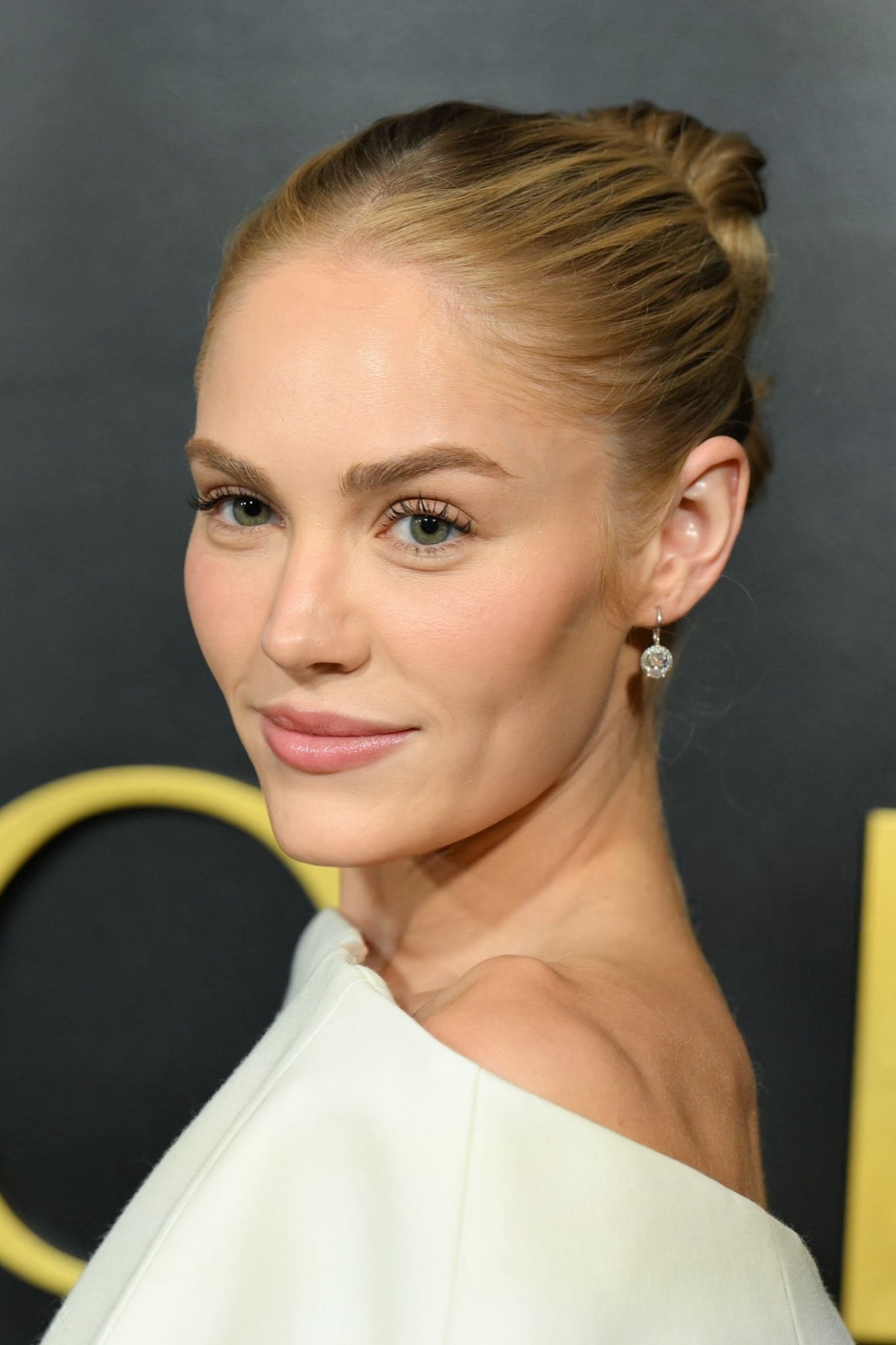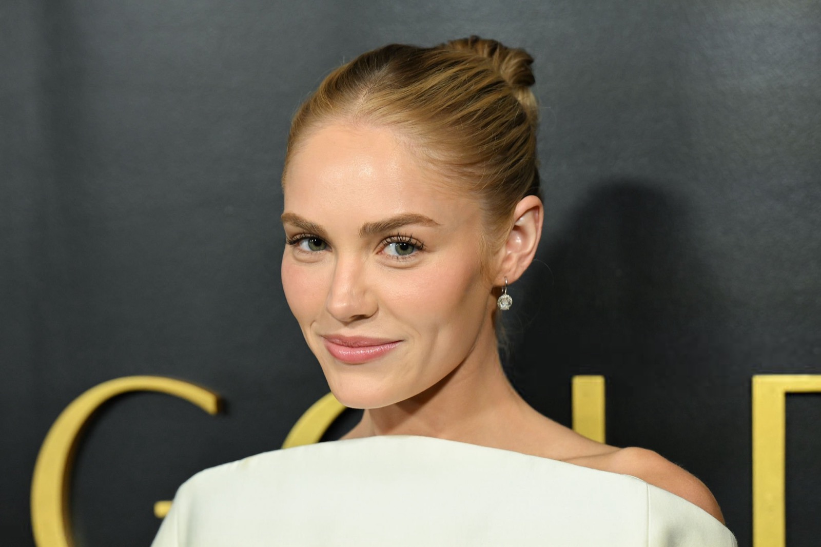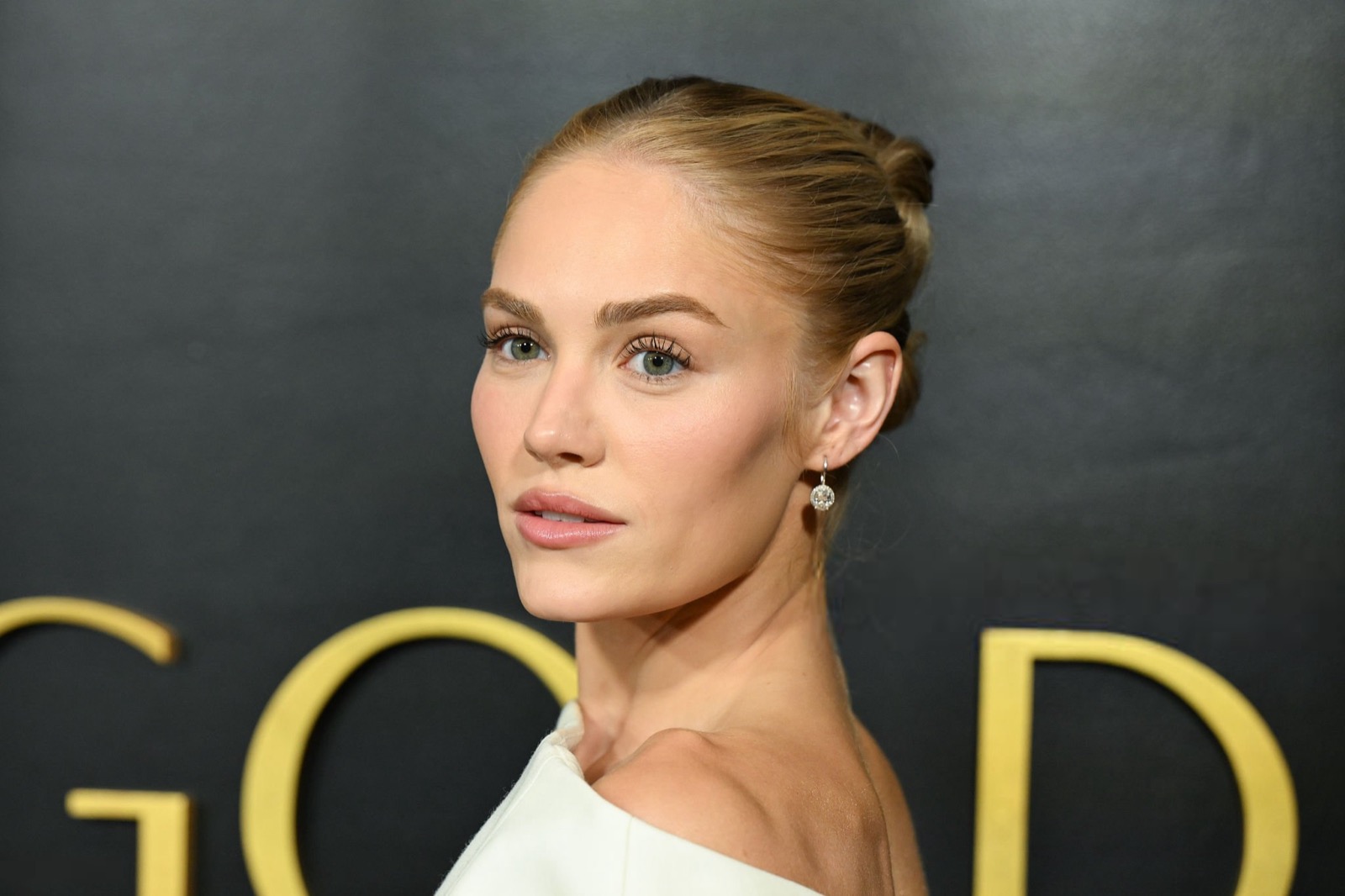 Au gala Golden Eve, Michelle Randolph arrive habillée comme un test de literie de luxe. Robe blanche géante, épaules avalées, silhouette transformée en nuage administratif. Elle sourit pendant que le tissu tente clairement de la déclarer disparue. Photocall solennel, posture droite, mais le vêtement a déjà pris le contrôle.