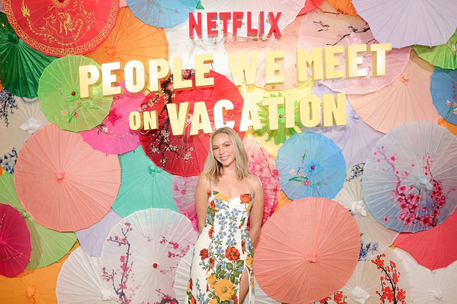 À la première du film People We Meet On Vacation, Jordyn Jones avance devant un décor si jaune qu’il menace la rétine. Robe fleurie calibrée, fente prudente, posture très validée par Netflix, elle sourit à peine, comme si l’enthousiasme était optionnel et facturé en supplément.