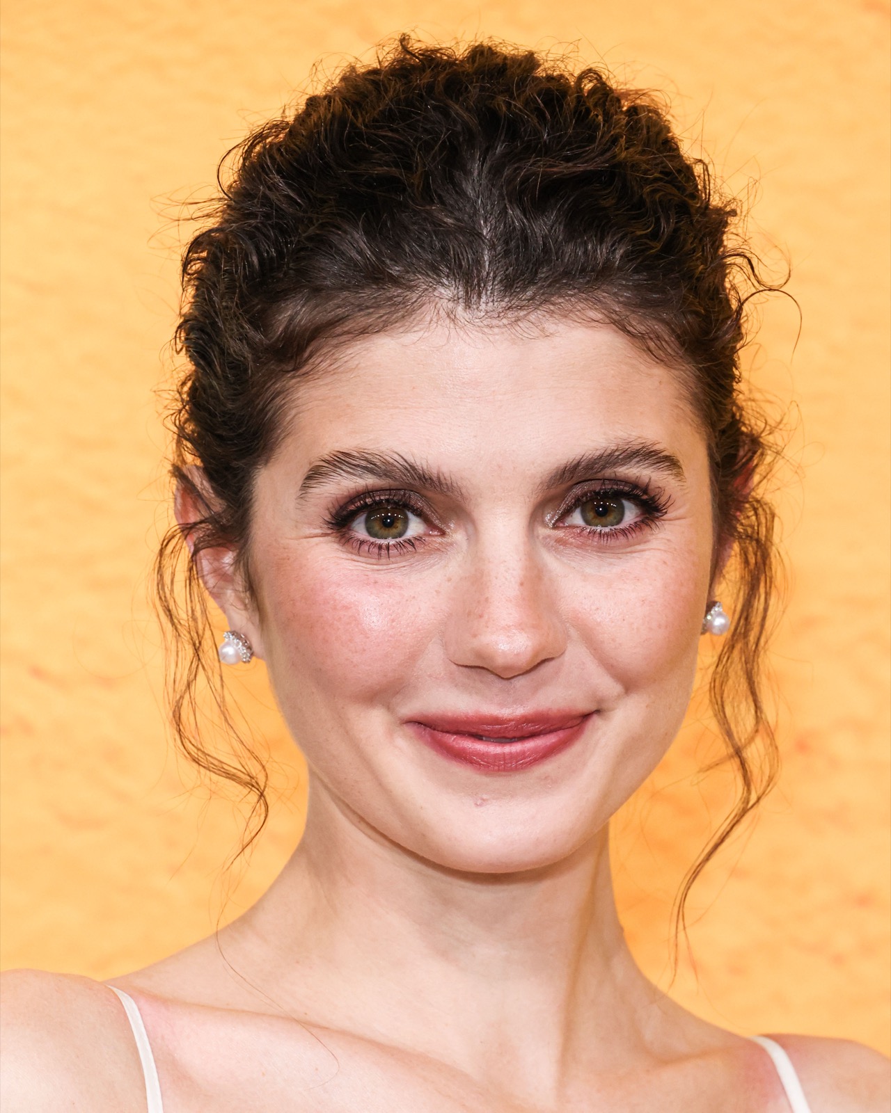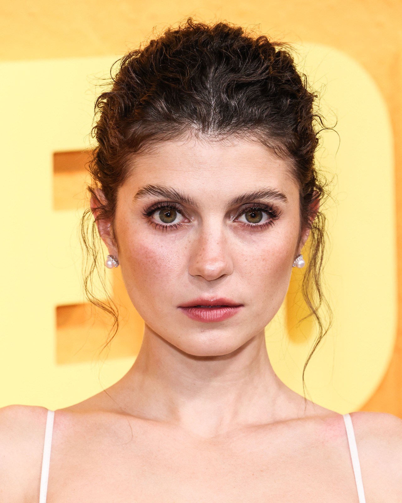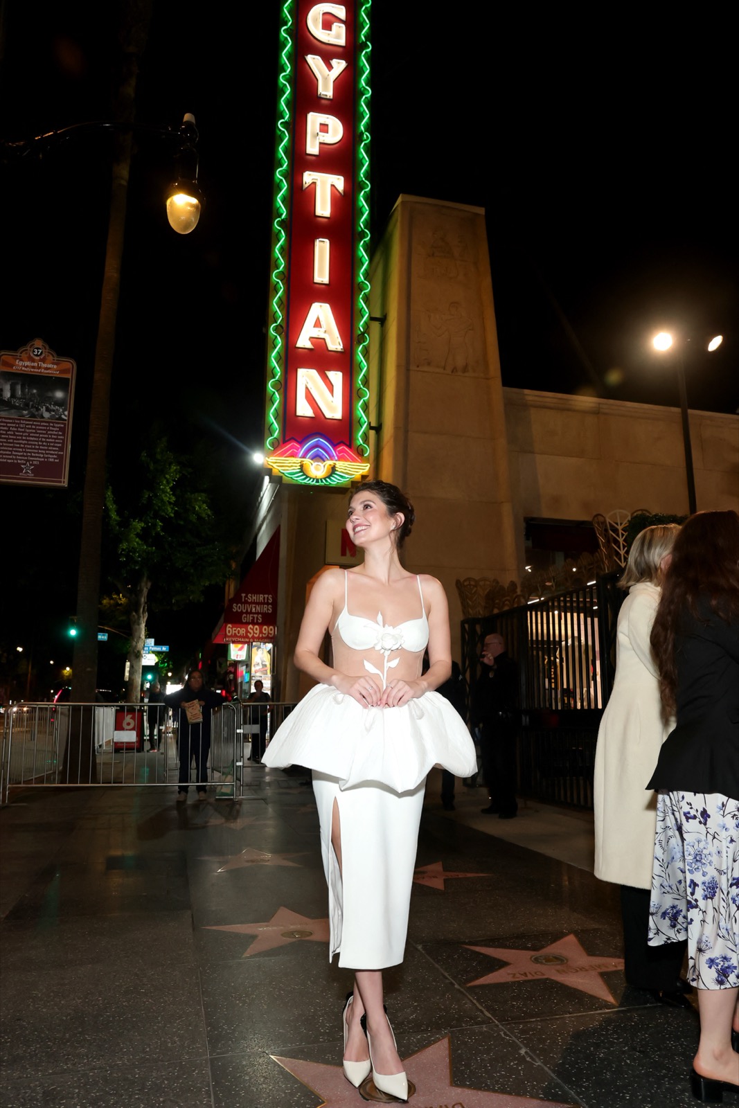 Emily Bader arrive sur le tapis rouge comme un dessert surprise. Le haut dit fleur délicate, le bas dit meringue en colère. Elle pose droite pendant que la robe occupe deux fuseaux horaires. Netflix sourit nerveux.