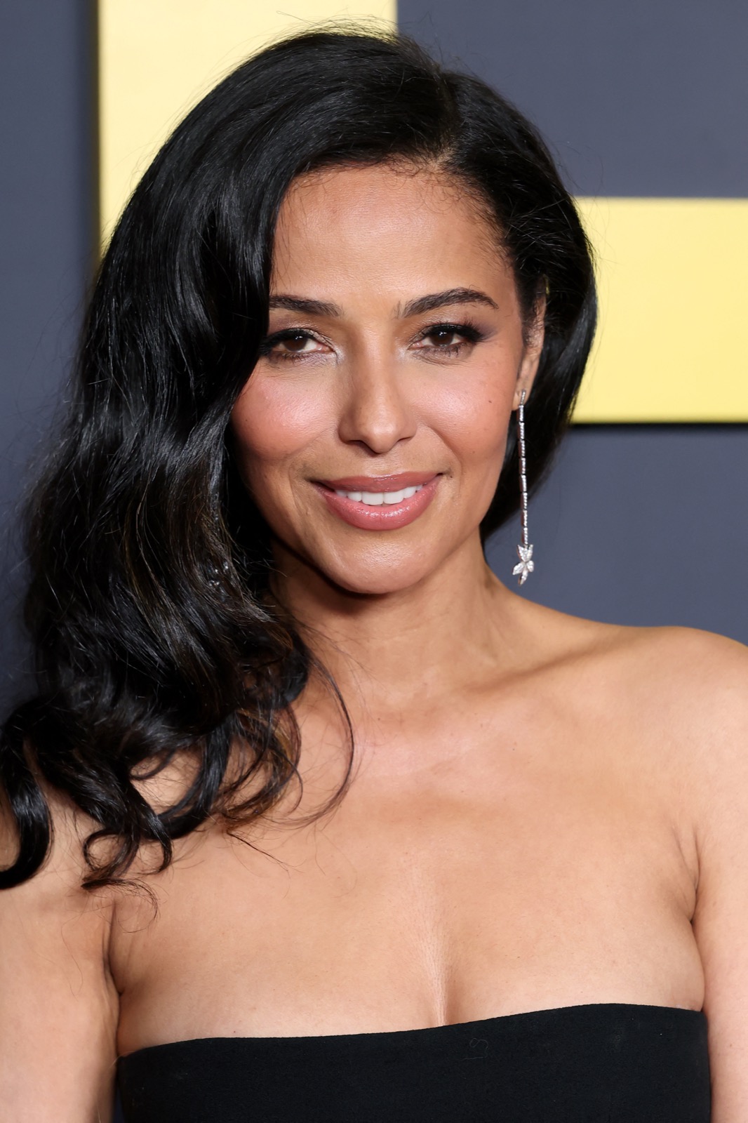 Meta Golding pose à la première L.A. de The Pitt, série dramatique diffusée sur HBO Max, droite comme une héroïne coincée dans un ascenseur social. La robe noire semble murmurer des secrets, pendant que le mur jaune hurle la promo.