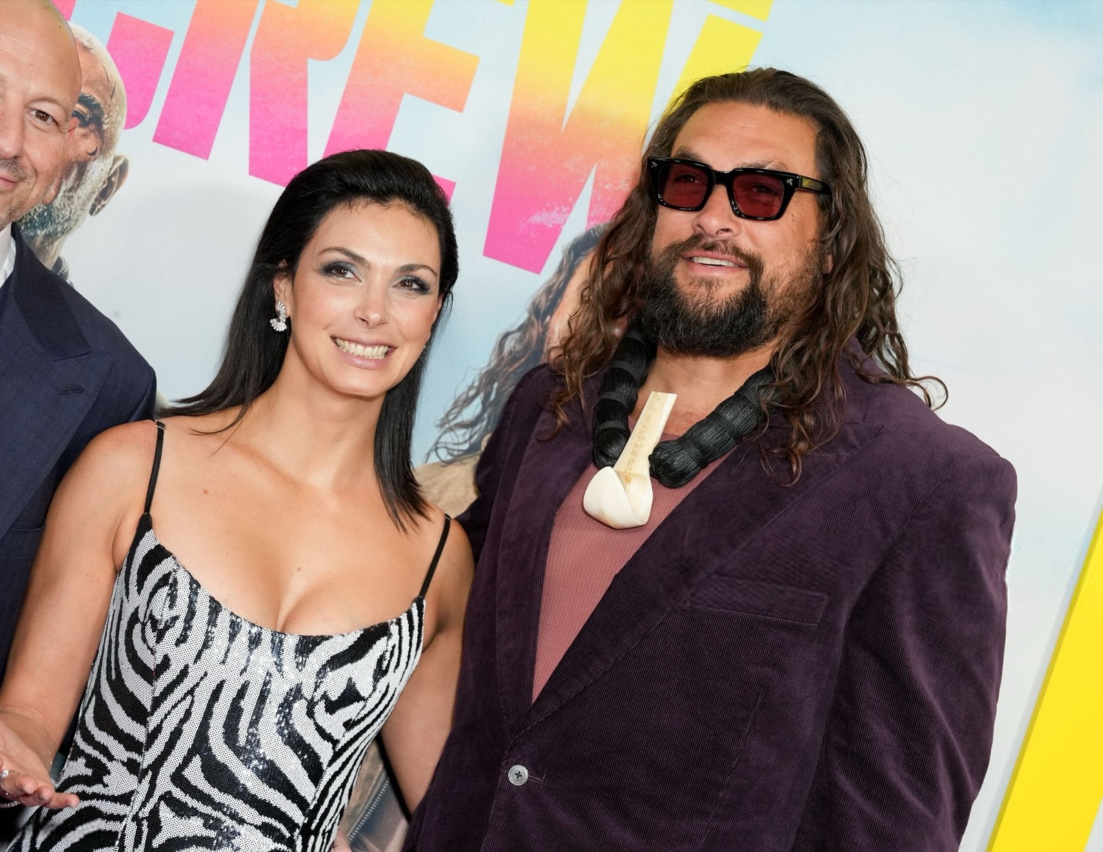 Devant l’affiche musclée, elle arrive en robe zébrée très disciplinée, sourire calme, décolleté concentré, comme si la soirée exigeait du sérieux… mais pas trop.