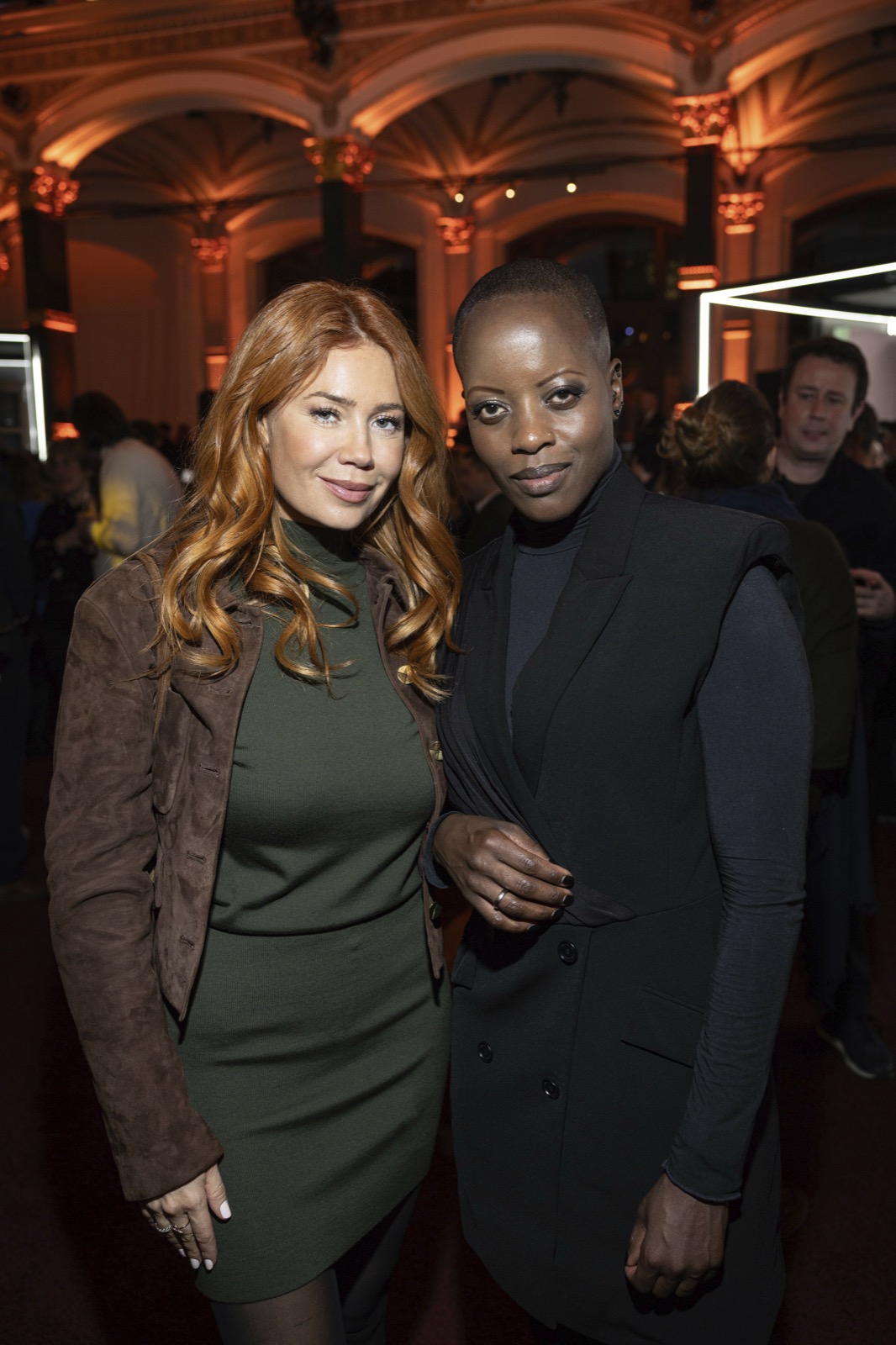 Elle pose devant le logo, sourire poli, jambes serrées, comme si la robe jurait de rester sérieuse toute la soirée.