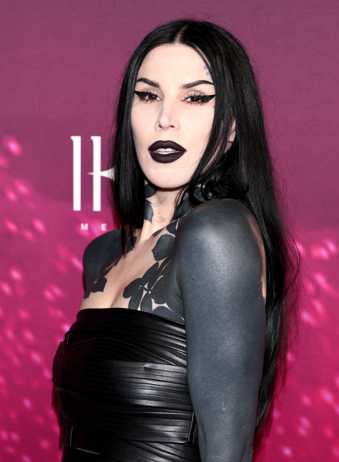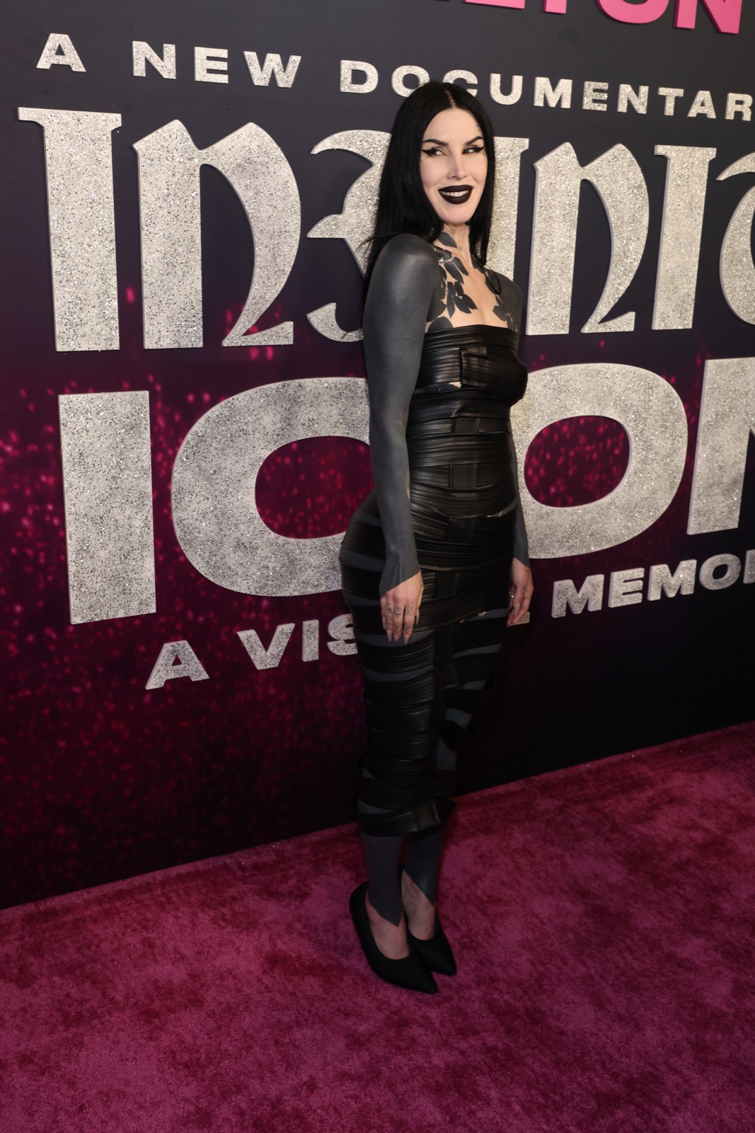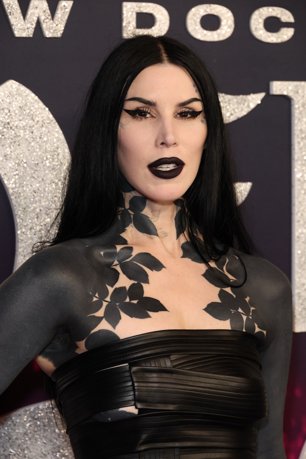Robe noire serrée comme un bandage, épaules peintes, regard qui pique, Kat Von D avance figée, comme si la tenue tenait le corps droit pendant que le sourire menace de craquer.
