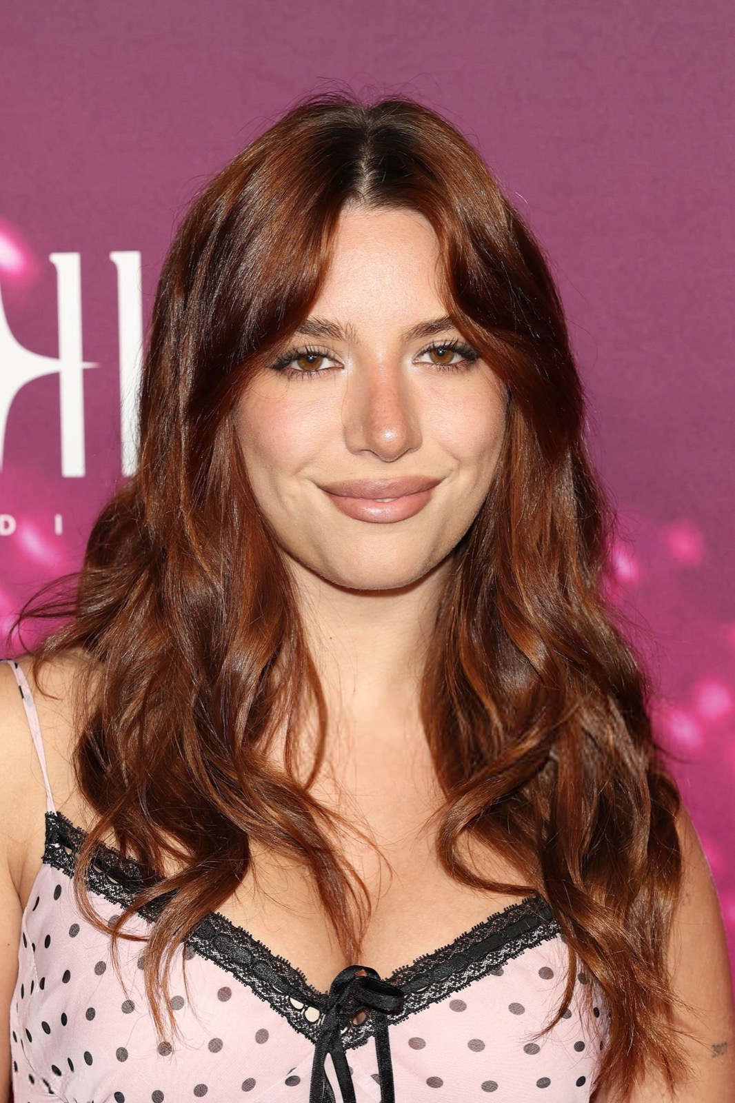 Robe rose à pois, coupe nuisette, Mackenzie Ziegler pose tranquille, mains jointes, sourire calme, pendant que la tenue joue la fausse innocence et laisse planer un trouble doux sur le tapis rose ce soir précis.