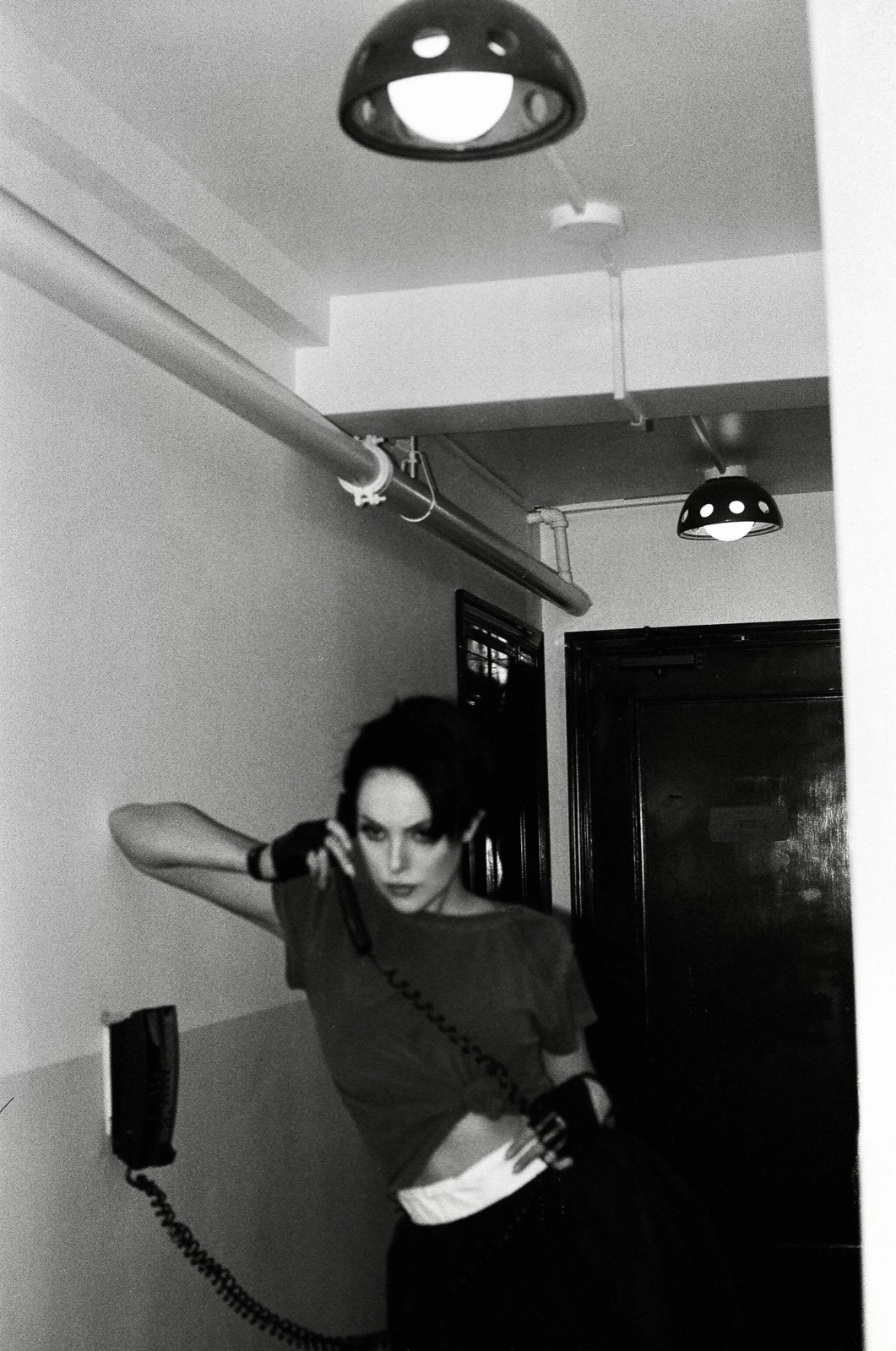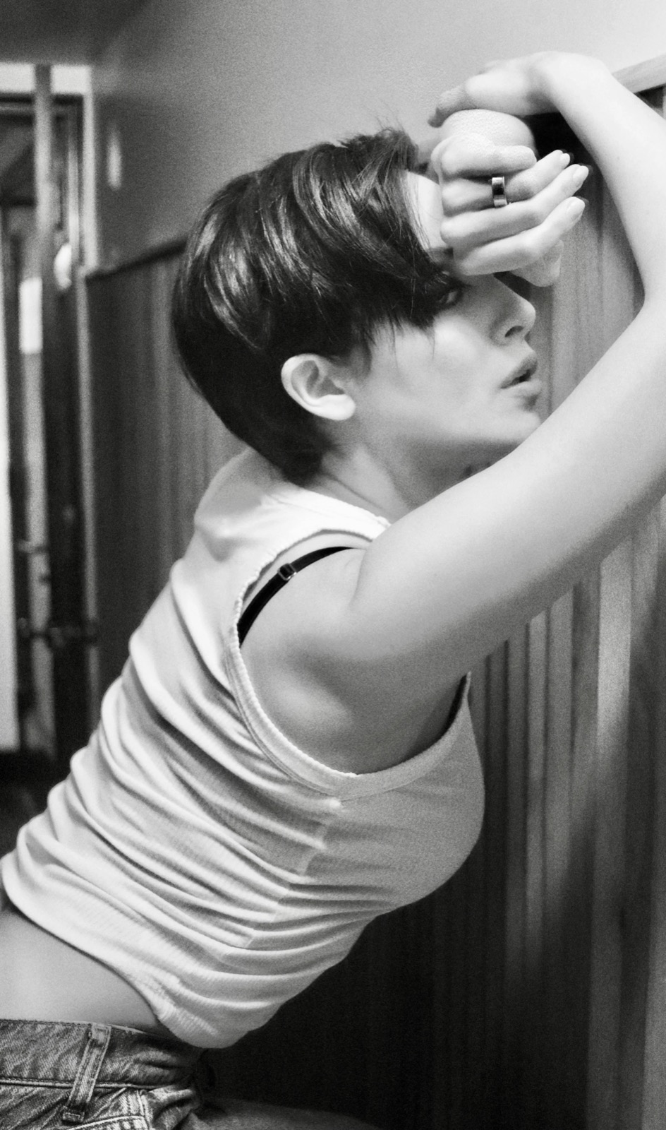 Dans un couloir étroit sous un panneau EXIT rouge, elle relève son tee-shirt, dos nu et regard sombre : on dirait qu’elle hésite entre poser ou provoquer l’alarme.