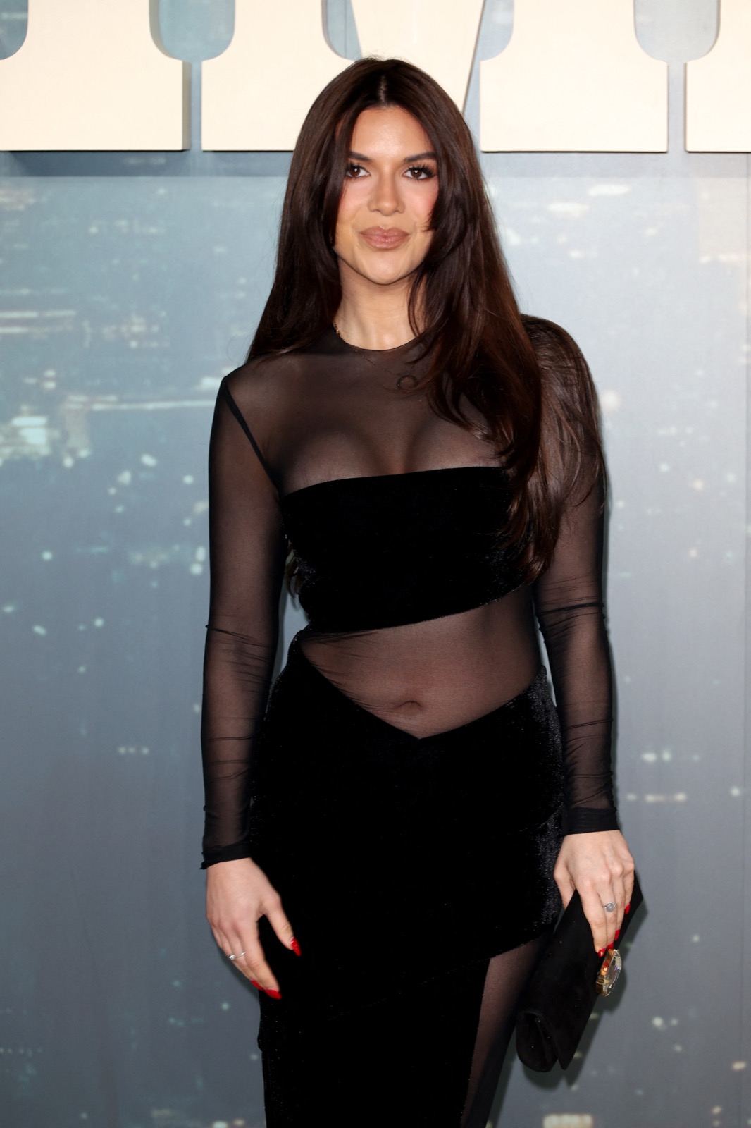 Sur le tapis, elle avance en robe noire transparente et talons aiguille, regard sage en façade, silhouette qui dit clairement le contraire.