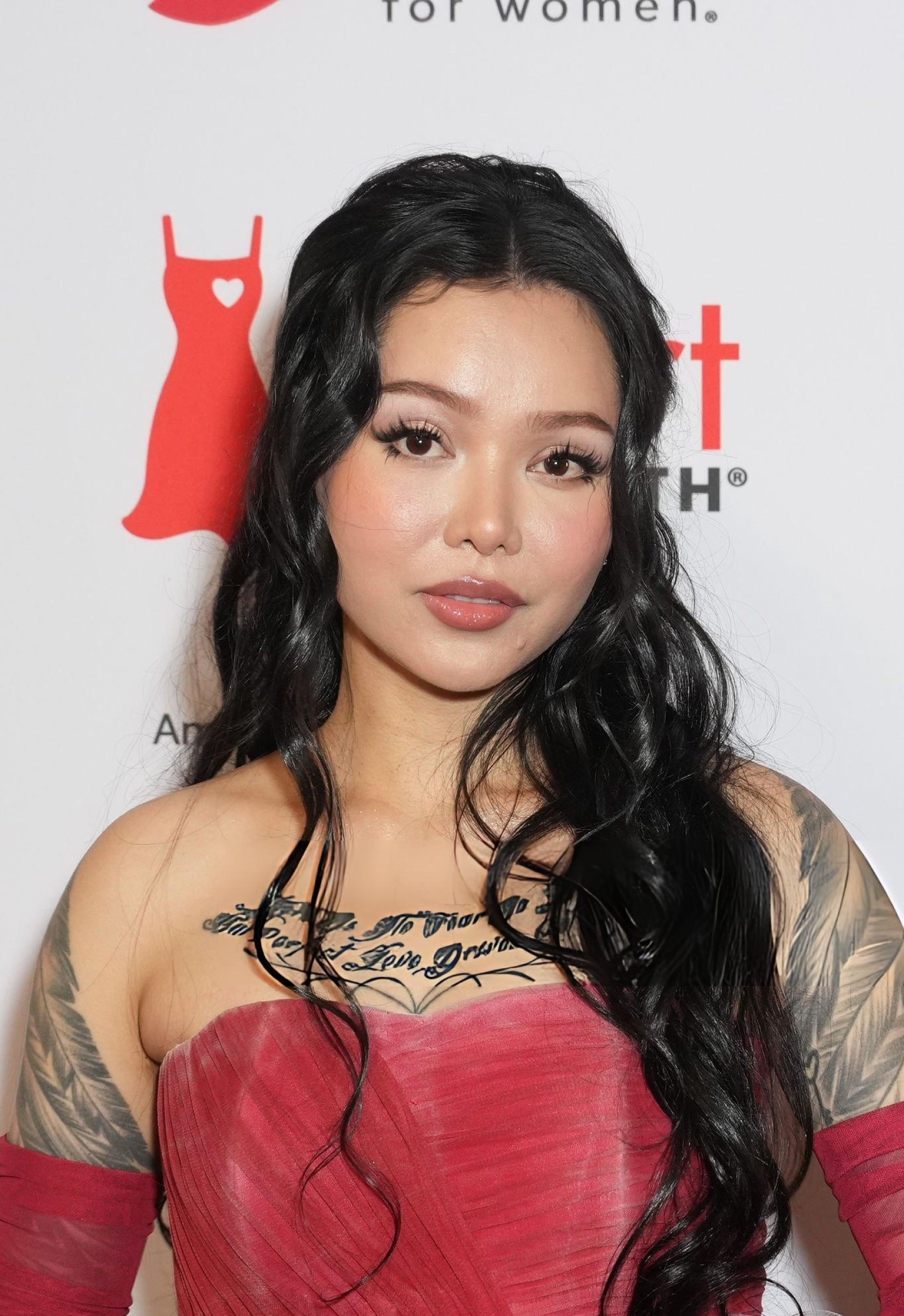 Bella Poarch débarque en robe rouge gonflée, corset serré et jupe XXL qui prend plus de place que le discours. Elle envoie un baiser, l’air sage, mais la silhouette occupe toute la scène. Même le rouge du tapis semble timide.