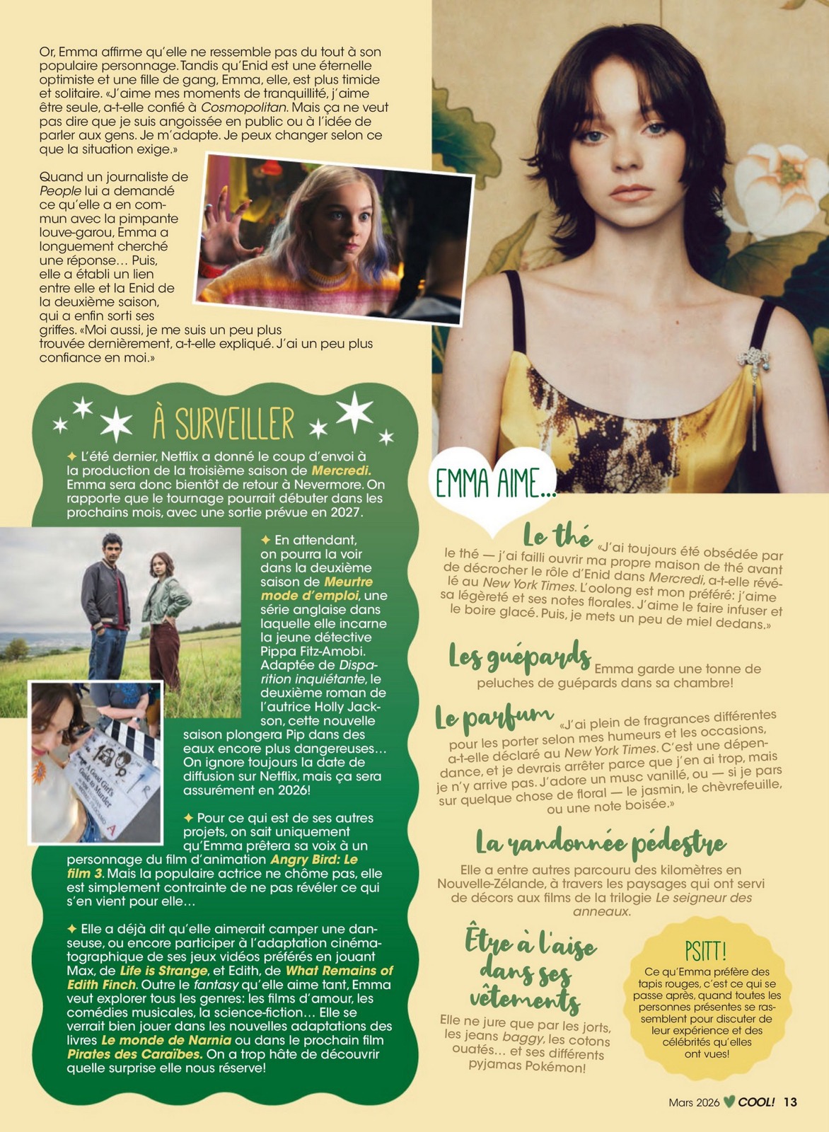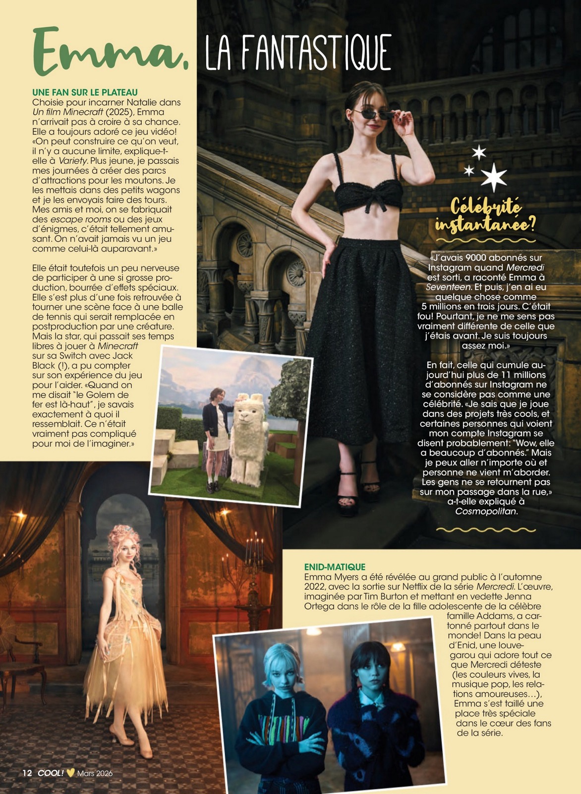 En couverture de Cool Canada pour mars 2026, vitrine mode où l’image façonne la nouvelle génération, elle s’impose logiquement. Révélée par Mercredi dans le rôle d’Enid, elle transforme ce succès en capital glamour bien géré.