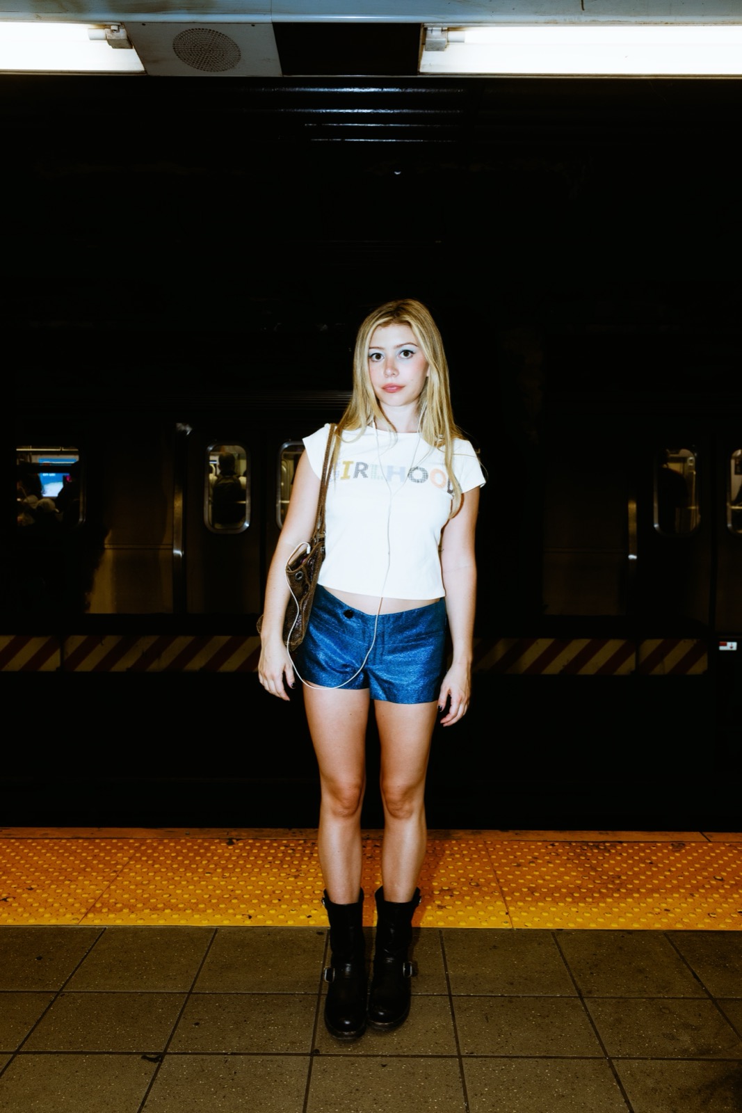 En t-shirt ajusté et short bleu satin, elle expose la pièce phare : ces bottes massives. L’effet visuel surprend. Un seul élément marquant domine : des jambes tranquilles prêtes à semer le chaos urbain.