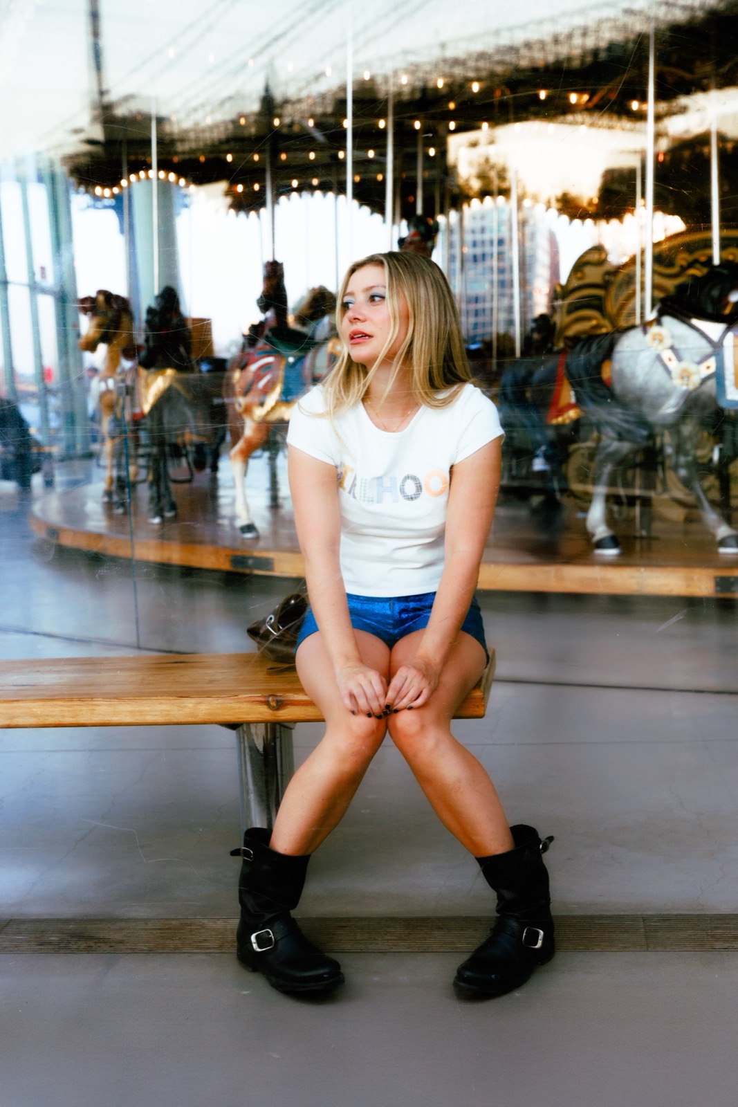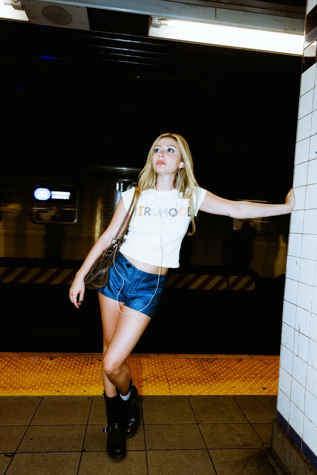 Elle pose en t-shirt innocent et short brillant, mais les bottes noires annoncent clairement qu’elle ne vient pas pour nourrir les pigeons.