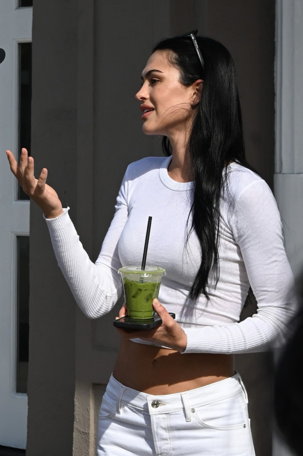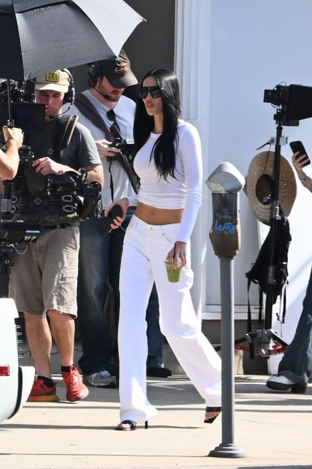 Total look blanc moulant, crop-top discipliné, pantalon taille basse rebelle. Elle se penche: la gravité demande un rendez-vous. Les lunettes restent stoïques, la rue perd sa productivité.
