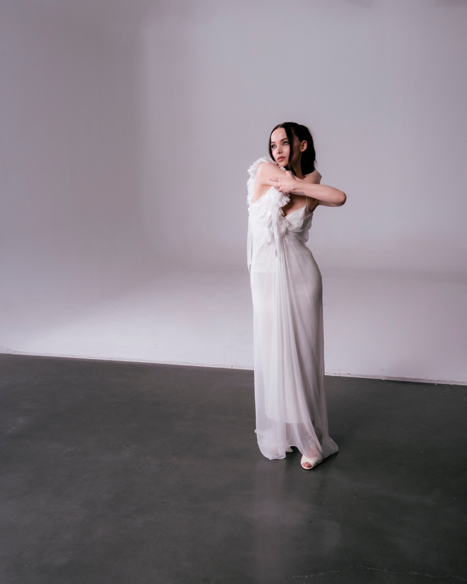 En robe transparente blanche à volants, épaules dénudées et regard félin, elle s’allonge pour le shooting de WWD en studio minimaliste. Effet vaporeux, silhouette moulée sous le tulle : on dirait un nuage… qui sait très bien ce qu’il fait.