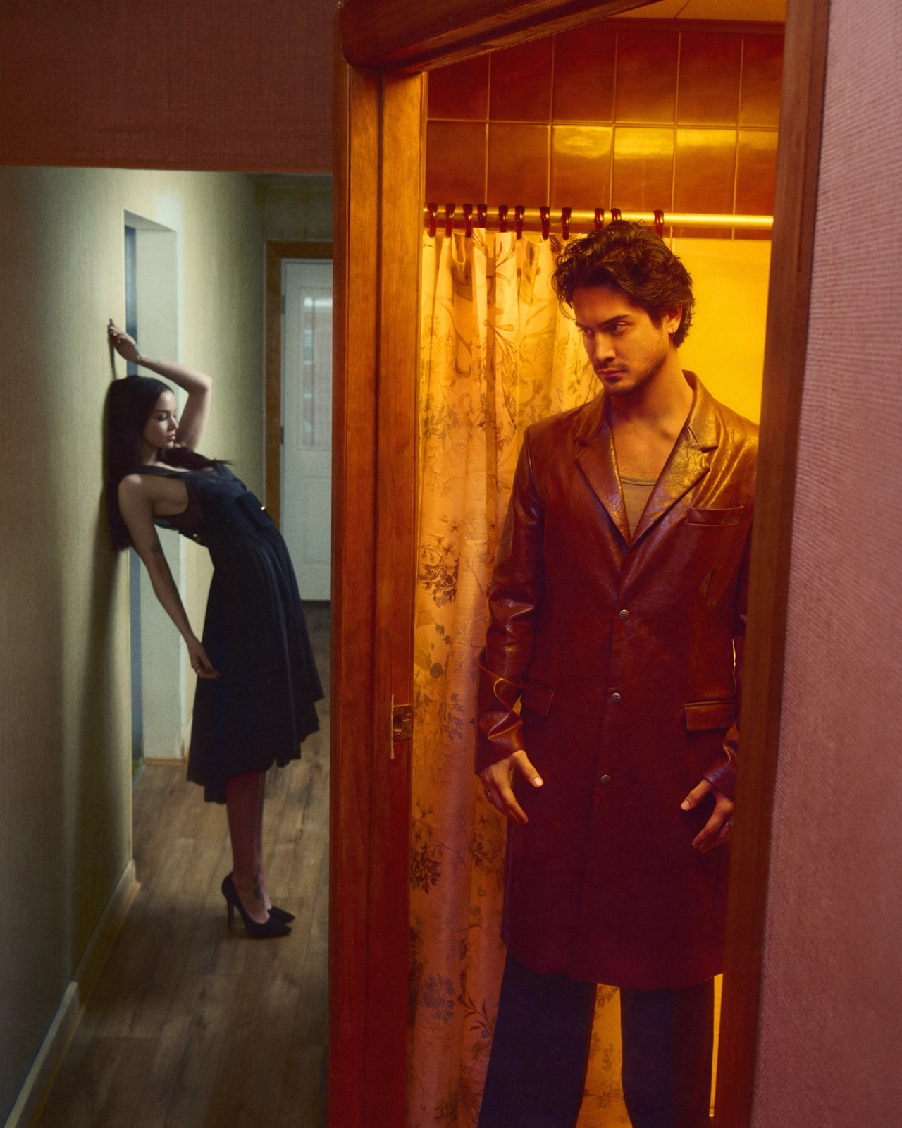 Pour Paper Magazine, la robe fendue et les talons nude transforment la pièce boisée en théâtre dramatique. Assise au sol, chaise retournée, elle joue l’effet femme fatale version rétro, regard mi-fermé, posture étudiée, tension contrôlée comme un plan-séquence trop chaud.