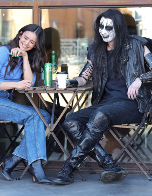 Nina Dobrev tourne une pub maquillage avec un goth en terrasse